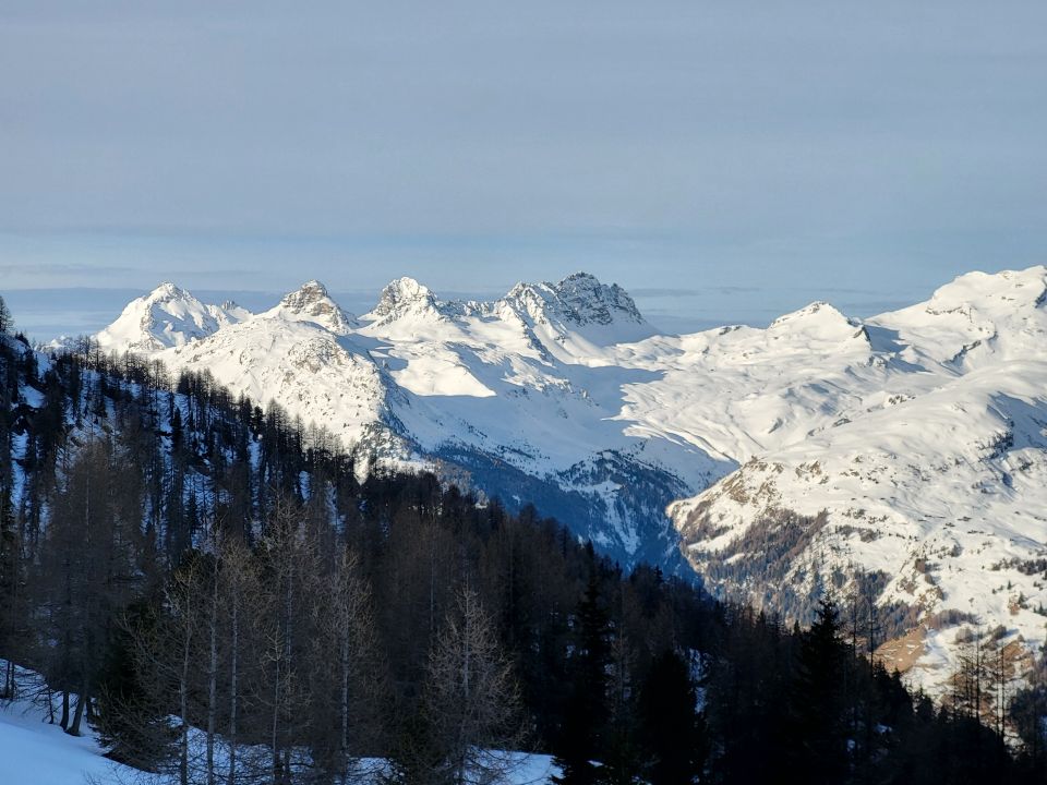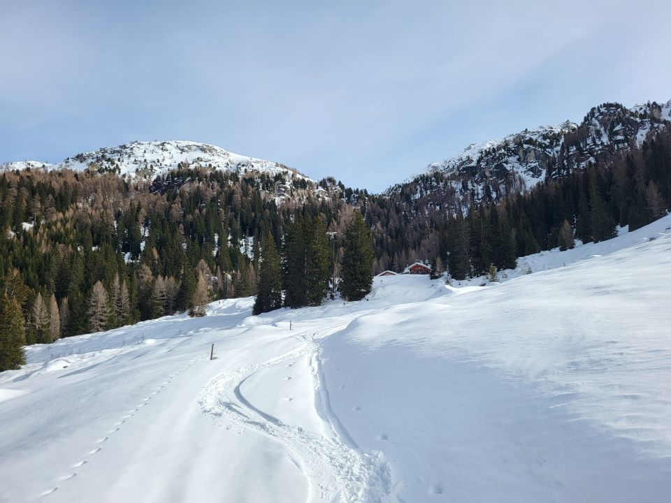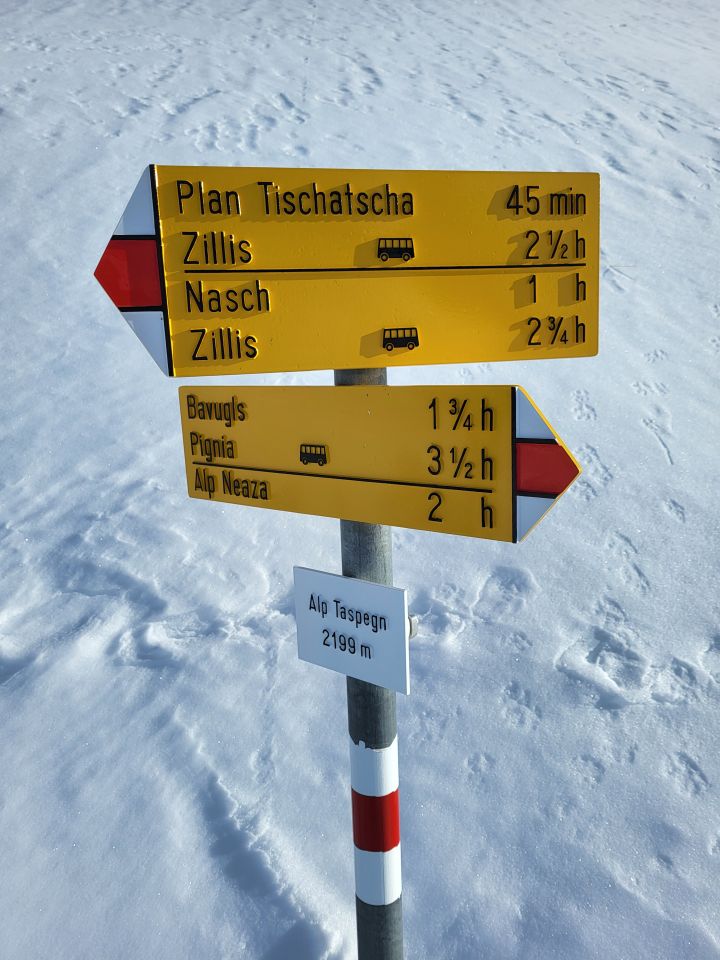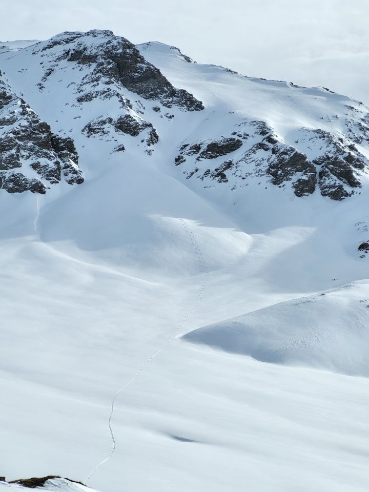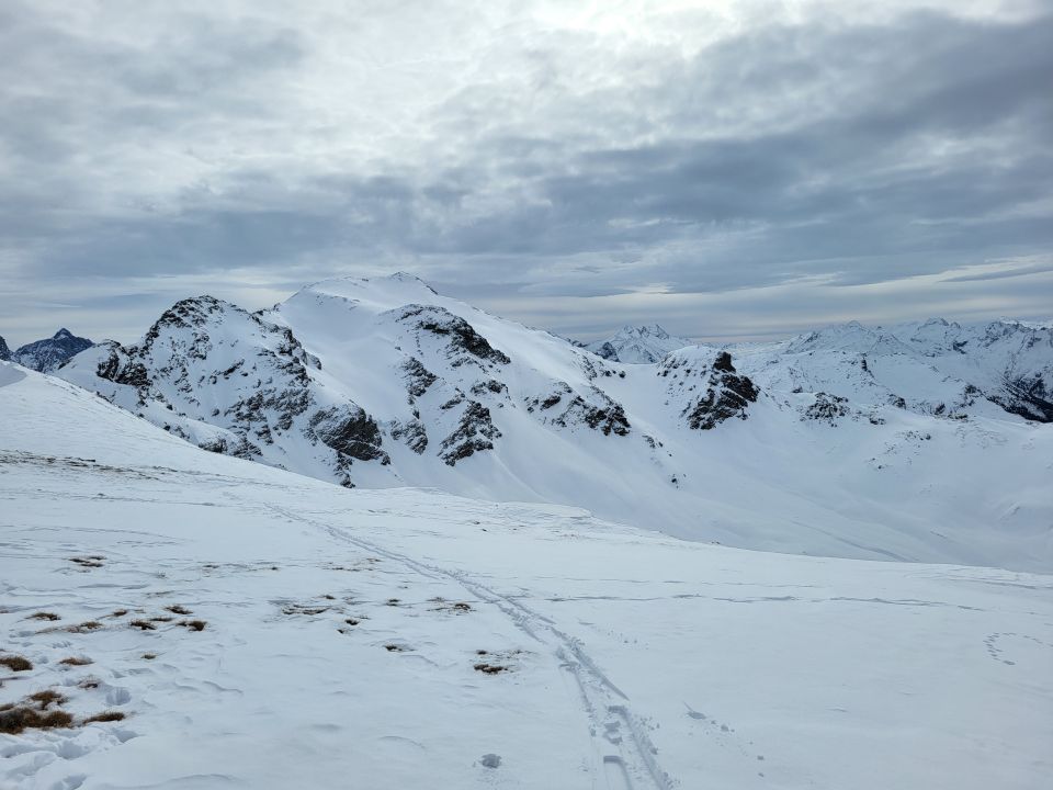 Skitragen bis ca. 1465 m.ü.M., Dann fast durchgängig Schnee für den Aufstieg und Abfahrt. Ein paar Bäume liegen im Weg. Ab Plan Tischatscha ca. 15 cm Pulver zum spuren. Gegen oben leicht zunehmend. Traverse unter der Alp gut zu gehen und vollständig im Schnee. Ich bin unter den Felsen Crap Seala zu Halla und über P. 2358 zum Grat hoch zw. Pintg Neaza und Curver. Dann kurz in die SW Flanke und wieder zurück in die Nordflanke und zum Gipfel hoch.