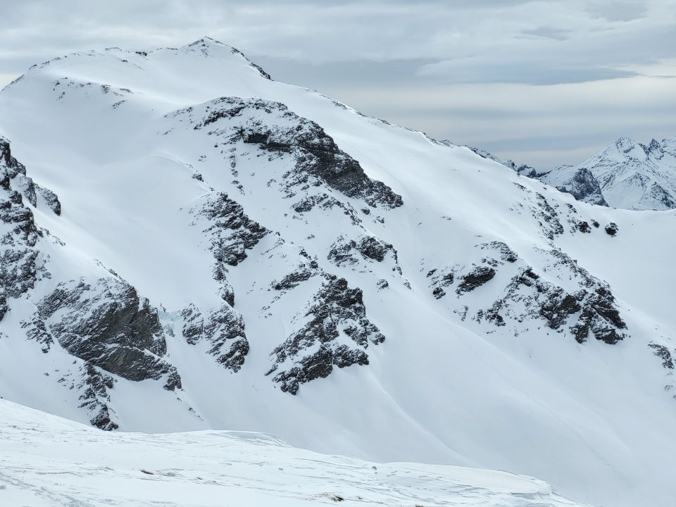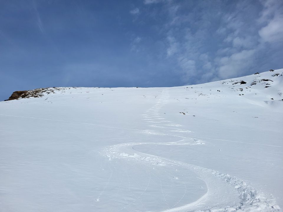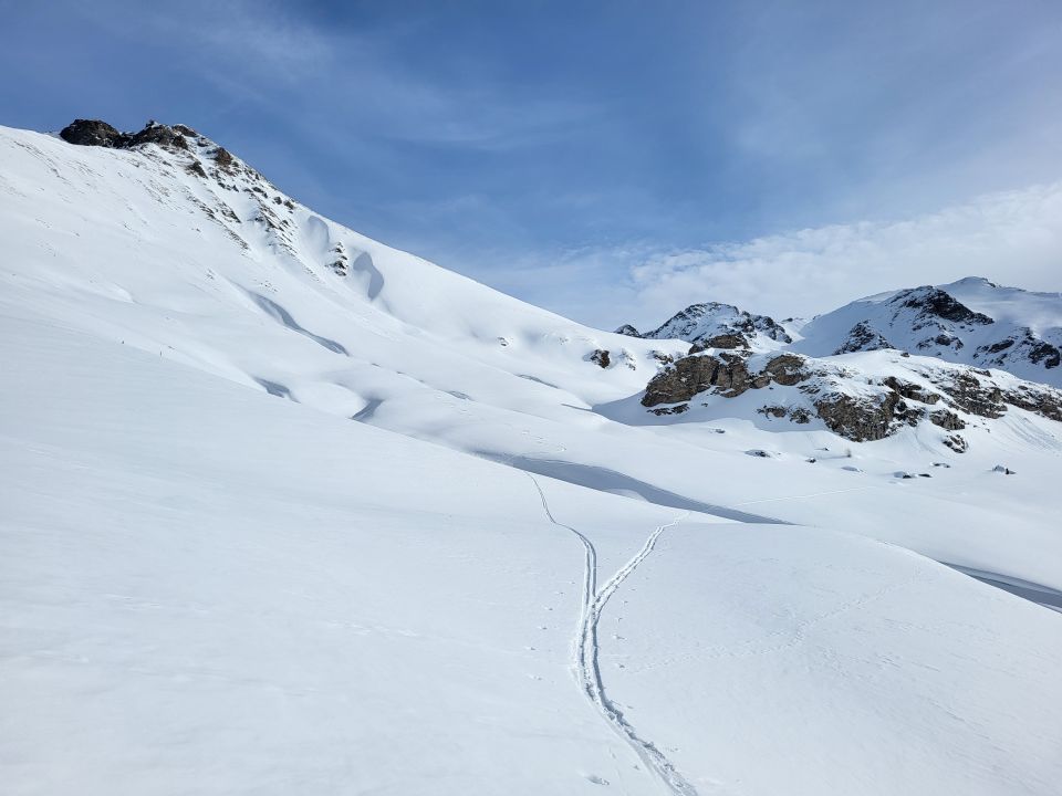 Abfahrt durch die Nordflanke oben kurz pickelhart dann leicht windgepresster Pulver. Im Abfahrtssinn die rechte Rinne gefahren, da schöner Fluffy Powder bis in den Talboden.