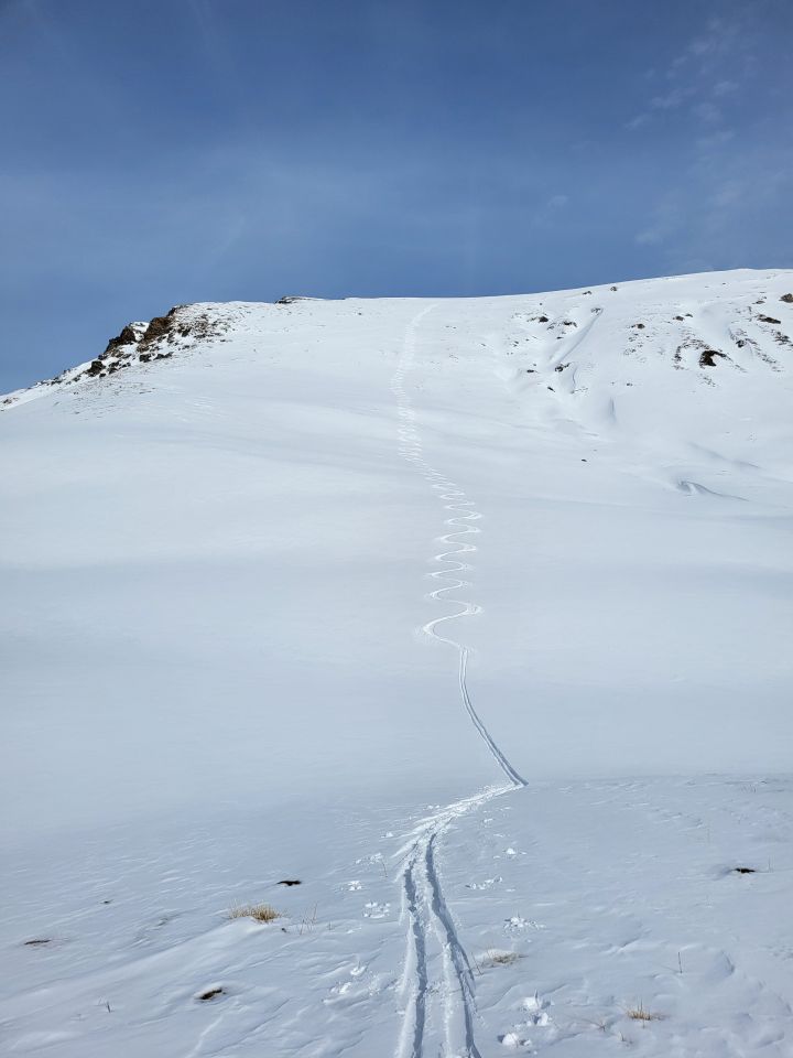 Dort neu angefellt und noch hoch zum Curver Pintg da Taspegn. Rundtour um beide Steinmänner und Abfahrt zurück in den Talboden und zur Alp Taspegn. Abfahrt leicht angesulzter Pulver, war sehr schön zu fahren :-)