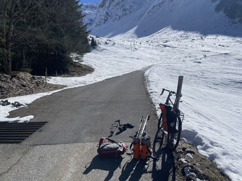 Mit dem Velo bis 1500 m. Man kann aber auch schon bei der Brücke starten, manche sind auch schon von Hindere Fildrich mit Fellen los und bis dahin abgefahren. Ausgeholt über Alpstrasse, da Bachroute wohl z.T. aper. Leider ist die Alpstrasse bis Mittelberg schon gefräst, so dass viele apere oder eisige Stellen da sind. Ins Obertal die direkte Aufstiegsvariante genommen, wobei heute die Hauptvariante entlang des Wanderweges war (sowohl im Aufstieg als auch in der Abfahrt, sah aber auch gut aus). Gipfelhang ging gut ohne Harscheisen, teilweise windgepresster Pulver. Oben kam dann der kalte Wind dazu.