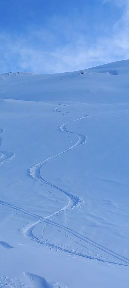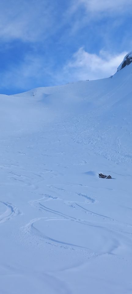 Start etwa 8.30Uhr, sonnig, frisch, an exponierter Lage recht windig. Ab Pass hat es eine gute griffige Spur. Harscheisen brauchte es nicht. Ab etwa 1800M.ü.M hat es gegen oben bis zu 15cm Neuschnee gegeben. Je nach Exposition pulvrig bis leicht gedeckelt aber trotzdem gut schwingbar. Untenraus etwas tiefer leicht gedeckelter Sulz. Mit Druck und Entlastung gut fahrbar. Ich bin ab Gipfel nicht meine Aufstiegsroute retour, sondern östlich durch die schöne lange und etwas steilere Mulde zur Passstrasse runter. Dort nochmal angefellt und oberhalb des Alphüttli (Pass) runter. Dies ersparte mir das lästige Hochstöckeln ab der Passbeiz. Ohne Geschiebe dann zurück zum Auto.