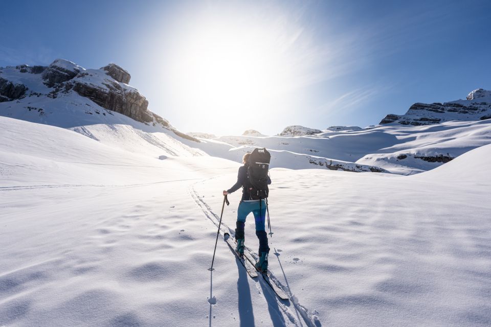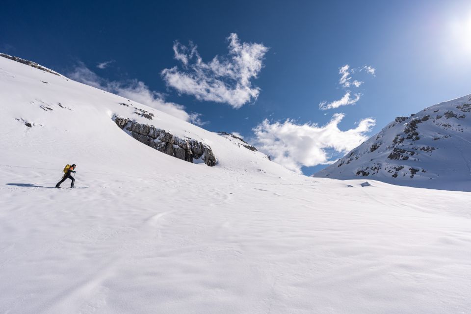 Bis Rinderweid (1307m) müssen die Ski fast durchgehend getragen werden (wir sind die Forststrasse hoch in Hoffnung auf Schnee und den Wanderweg runter). Ab dort dann ausreichend Schnee, ab ca 1600m geschlossene Schneedecke und immer noch viel Schnee. Der Regen/Schnee Freitag war bis zur Torberglücke in einer gut gebundenen und sehr schlecht mit der harten/eisigen Altschneedecke verbundenen Schicht vorhanden. Dementsprechend hat entlang der Route viele teils mittelgrosse vermutlich am Freitag ausgelöste Schneebretter, deutlich instabilere Verhältnisse in dieser Höhenlage als im Bulletin prognostiziert. Gipfelanstieg dann problemlos über von der Sonne aufgeweichten nassen Neuschnee. Nach vorsichtiger Erwägung haben wir uns für die Abfahrt durch die Nordwest-Flanke entschieden. Hier deutlich bessere Verhältnisse, lockere ungebundene Pulverschicht auf teils ruppiger Altschneeoberfläche. Anscheinend hier wesentlich weniger Windeinfluss als in der Aufstiegsroute.