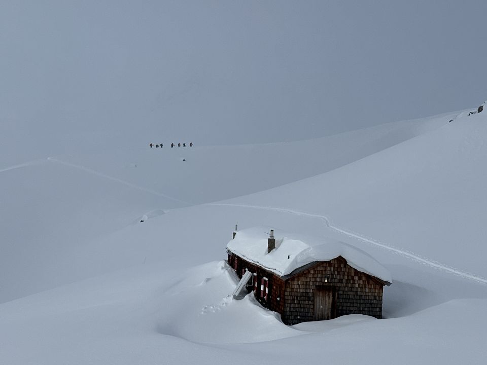 Vernagthütte hat ab heute geöffnet. Vor uns starteten 7 Skitourengänger, welche in Richtung Fluchthorn stiegen. Sie überholten uns im Abstieg von der Vernagthütte beim Wegekreuz unterhalb vom Platei.
