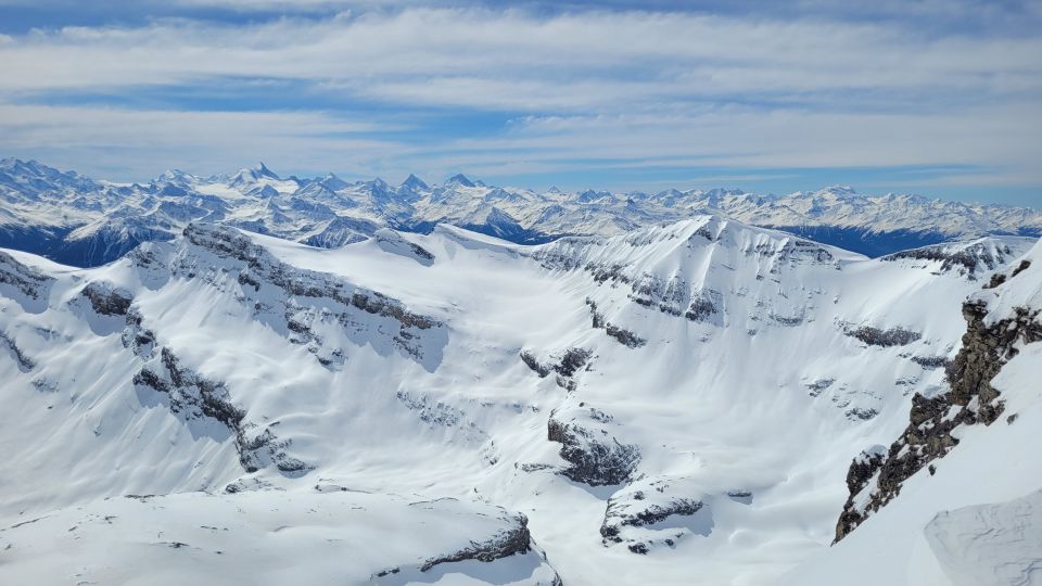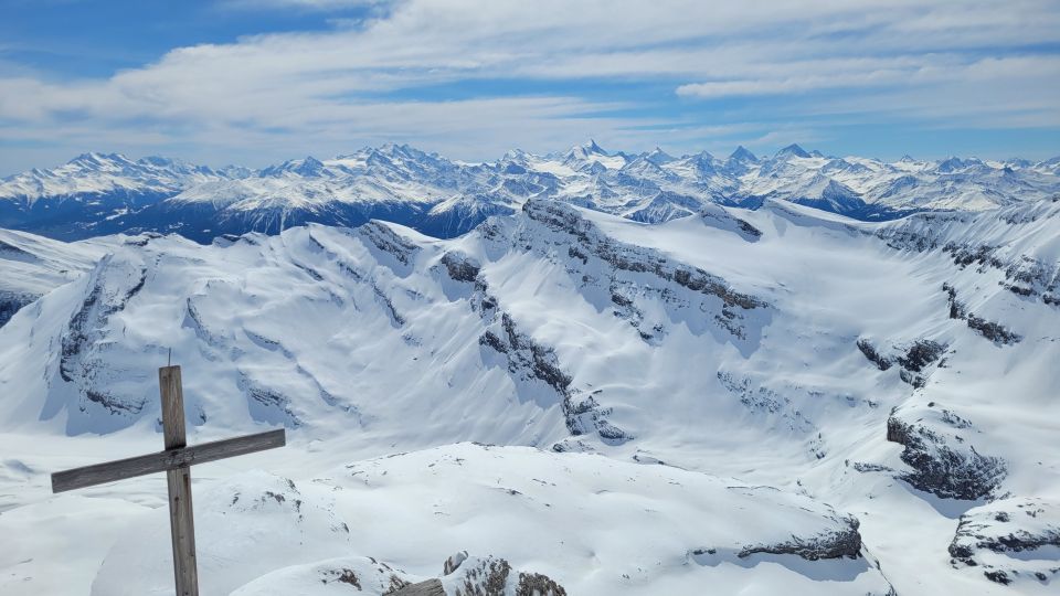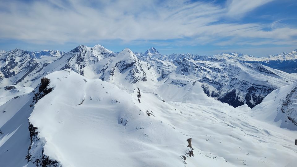 Frühstücksplatz, im Aufstieg mit Ski bis unter die Wächte, dann in gutem Trittschnee in wenigen Schritten hoch. Im Abstieg umgekehrt oder auch mit Ski möglich.