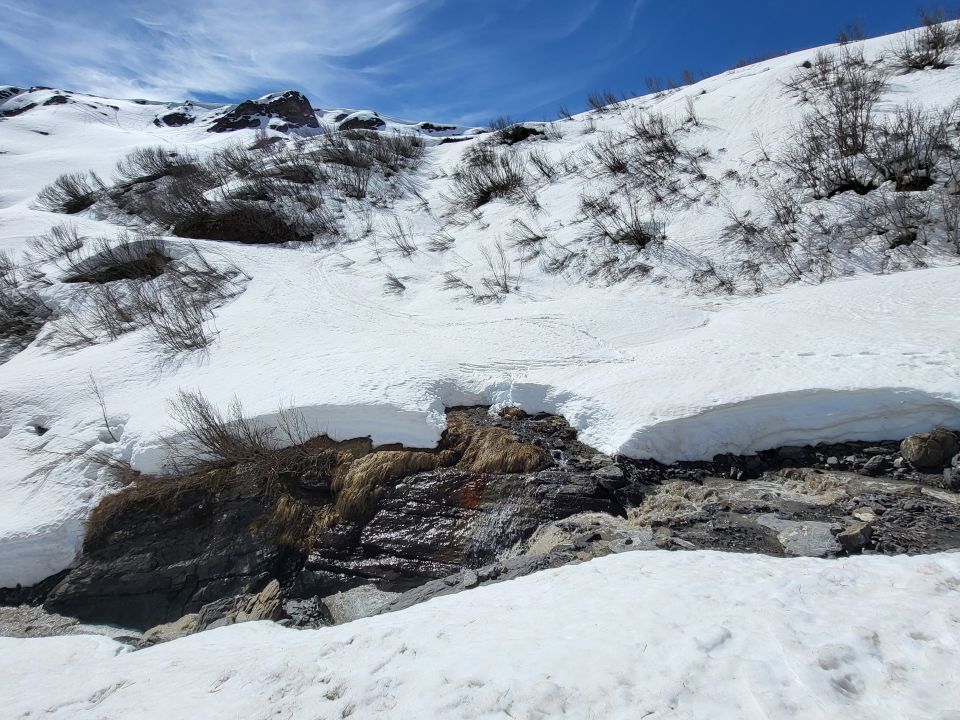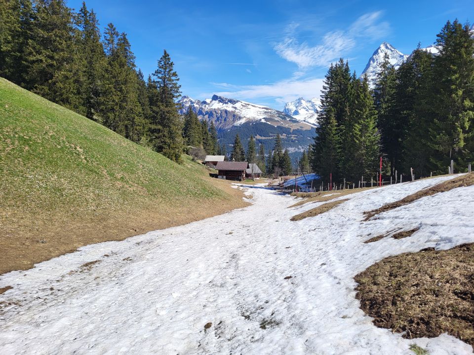 In der Abfahrt von der Wasenegg war ich froh, als ich endlich unten war: sehr nasser Schnee, Fischmäuler und grosse Gleitschneelawinen. Fahren konnte ich bis kurz nach der Schiltalp, dann war Schluss mit Schnee und ich wanderte bei grosser Hitze zurück nach Mürren.
