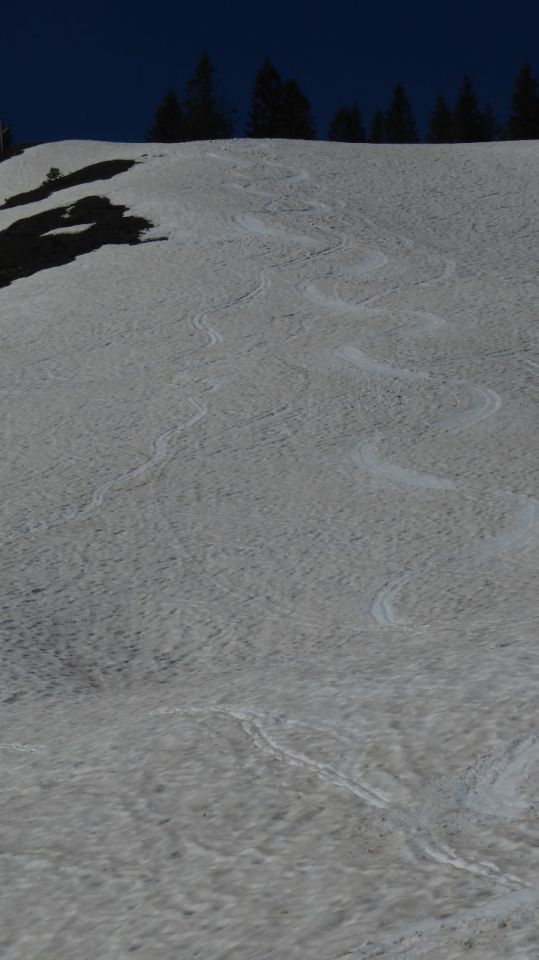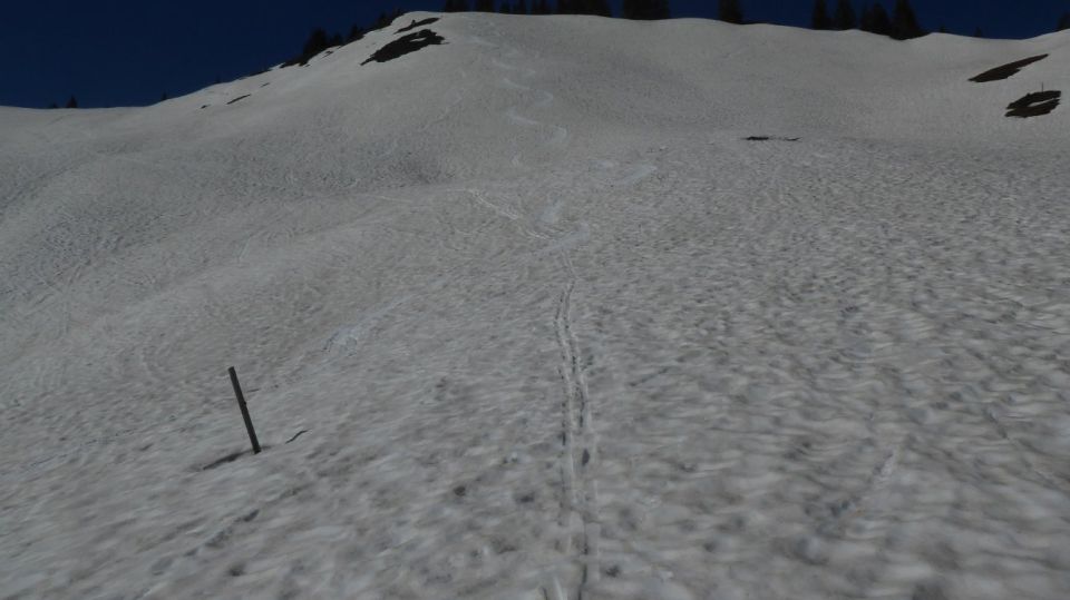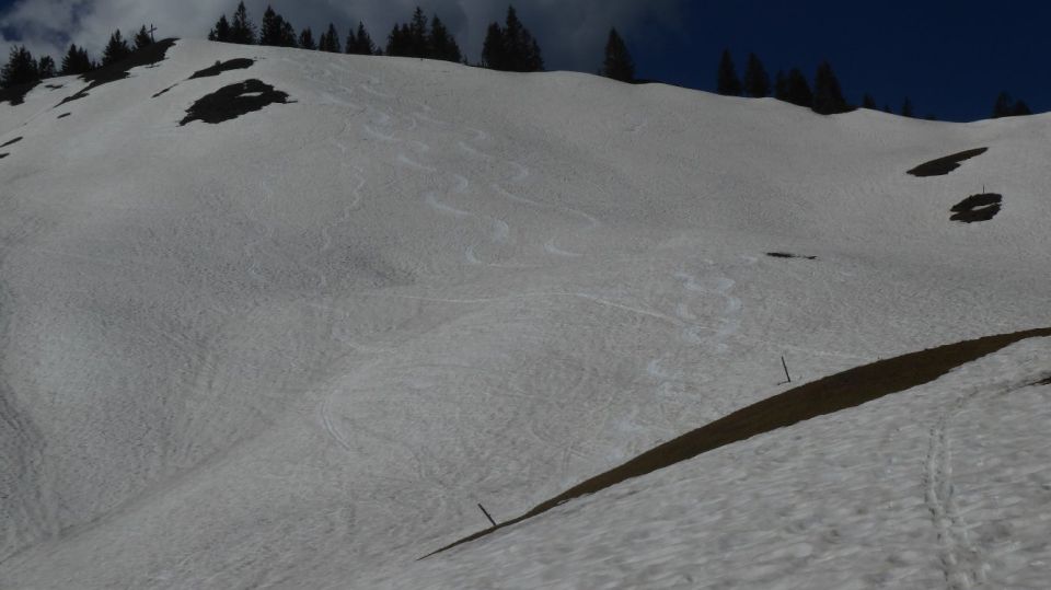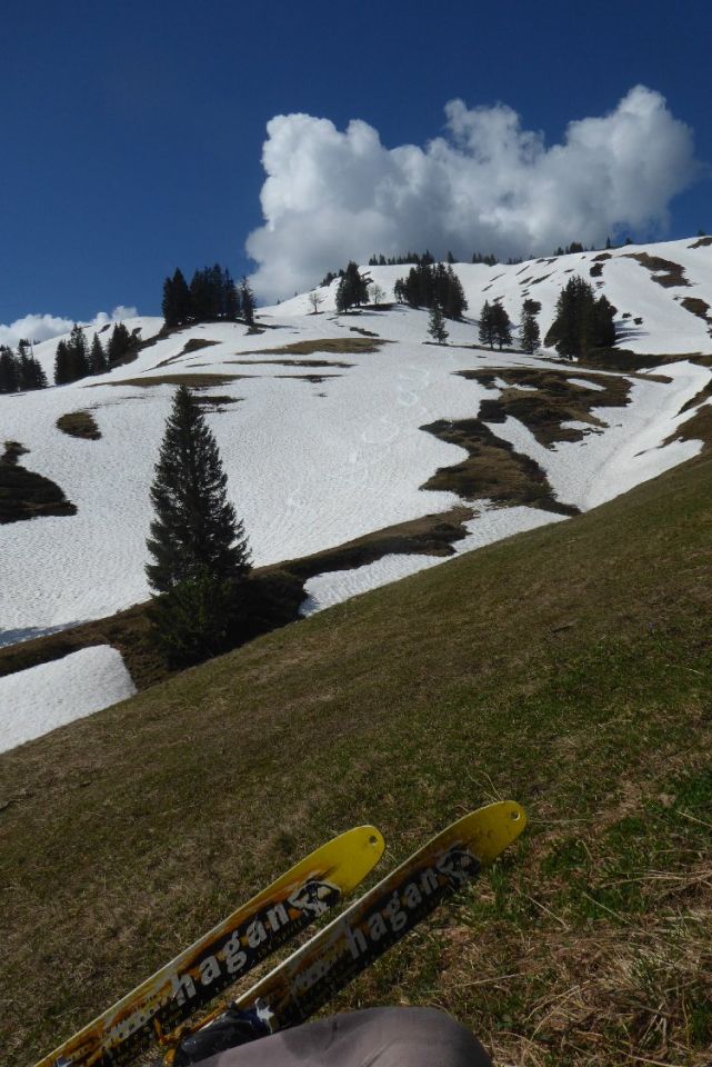War heute mit meinen Kurzen (1,30m) unterwegs, die waren eine Zeitlang Trendig im Frühjahr. Im Aufstieg kein Nachteil, in der Abfahrt wären die Langen im delligen Gelände etwas besser gewesen. Weit und breit niemand, so hat es der "Alte Herr" gerne !