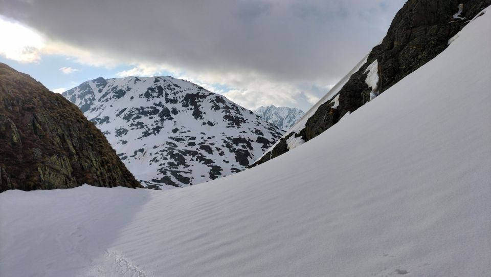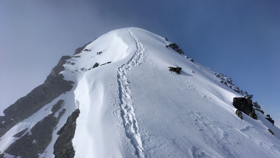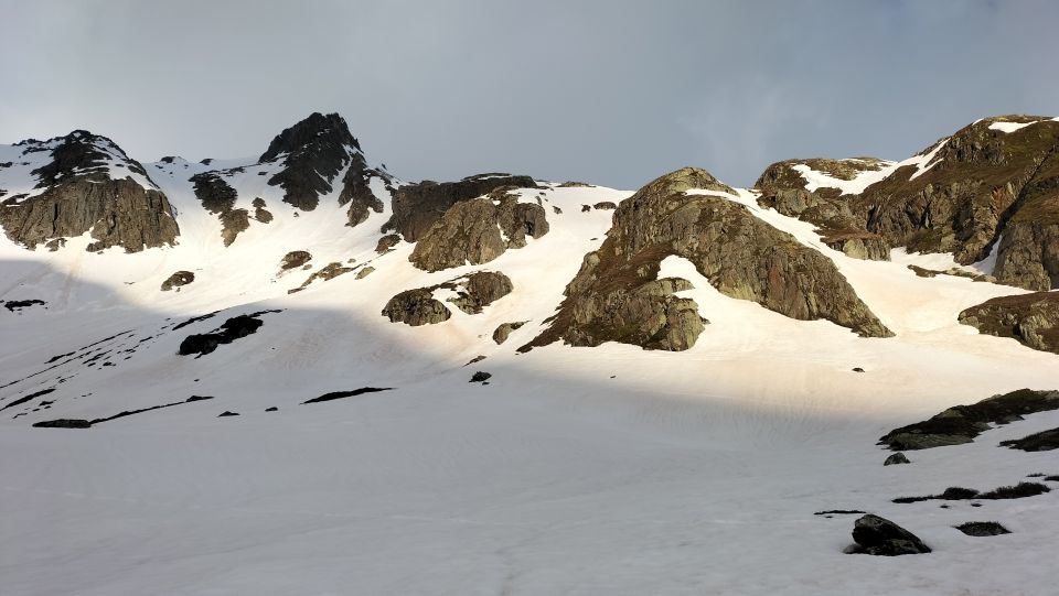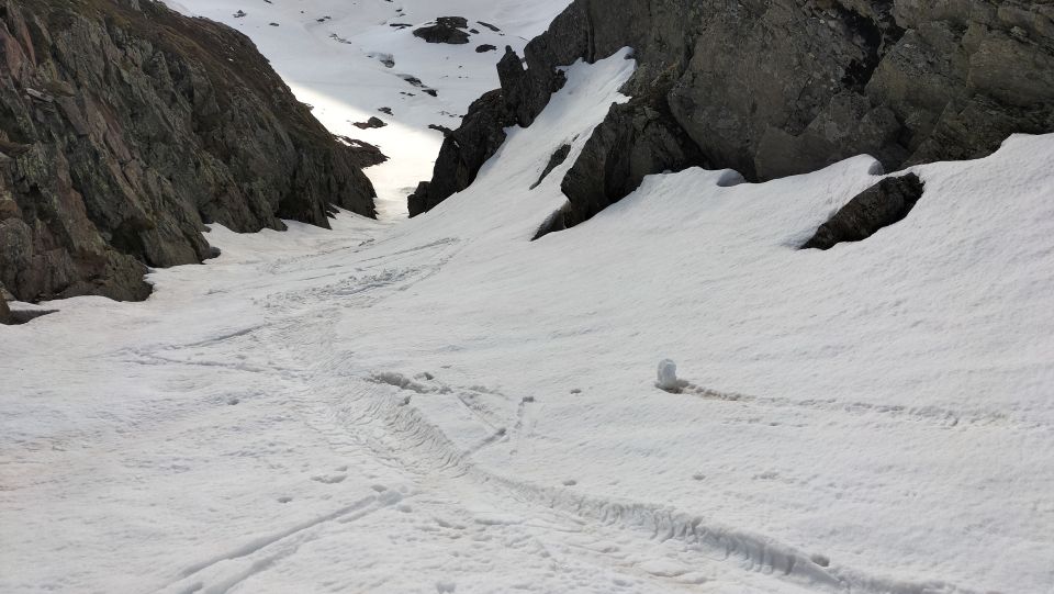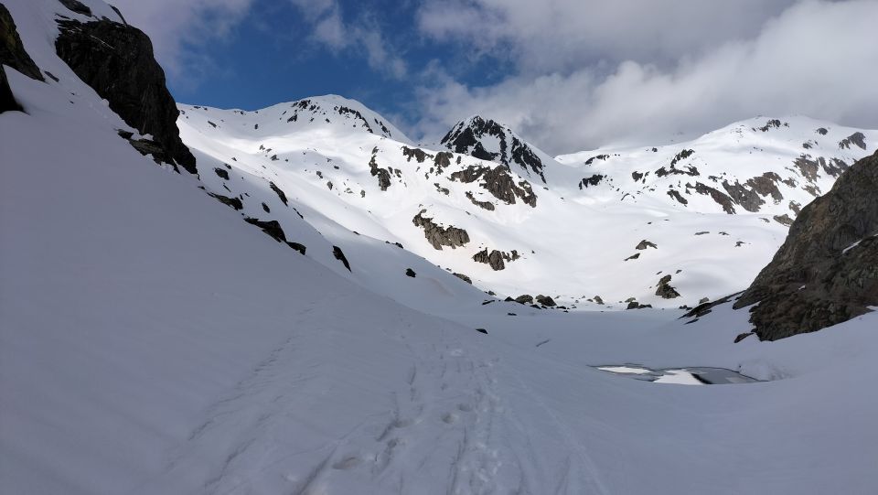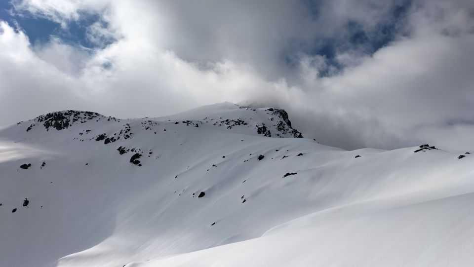 Start der am 6.10 Uhr bei Surpalits das Wetter vom Süden her schlechter, die Ski mussten 10 Minuten getragen werden , die Abstahlung der Schneedecke war heute nicht so gut, trotz den kühlen Temperaturen, ab Lai da Tuma See decklig , oben den gut mit ein hauch von Pulverschnee, Gipfelkopf guter Trittschnee, Achtung auf Wächten, Abfahrt oben leichter Nebel mit guten Verhältnissen , am Mittelteil Bruchharst, ab Lai da Tuma Sulzig.