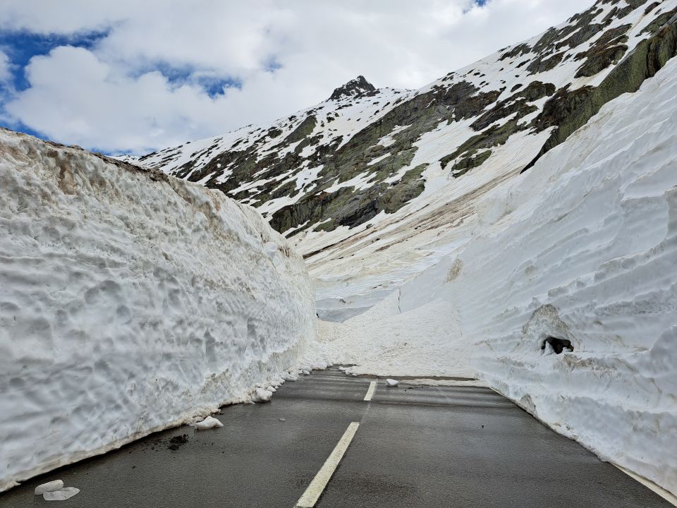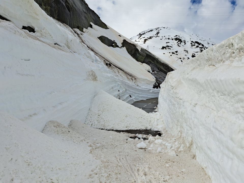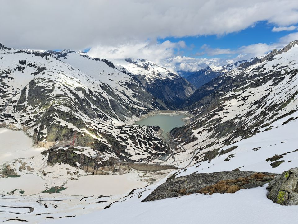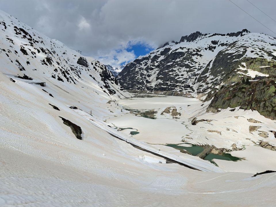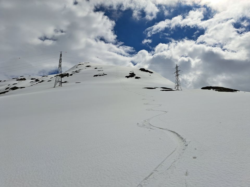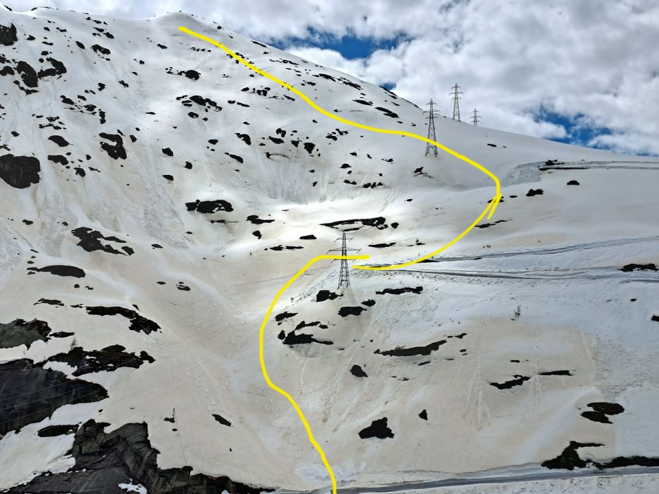 Mit Velo von Räterichsbodensee P bis Grimselsee 1900m und ca.400m nach abzweig Grimsel Hospiz auf Ski gewechselt und links hinauf die 2 Strassenkurven abgekürzt auf den Pass.