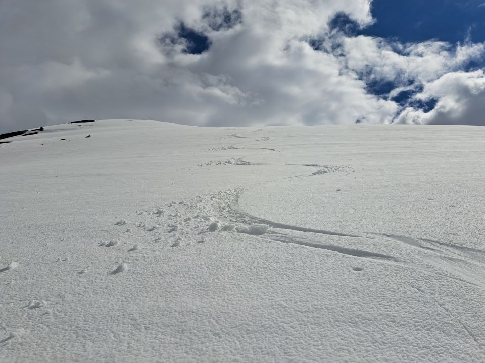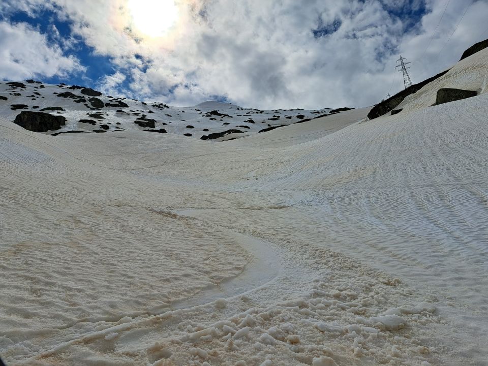 Schnee um 9 uhr oben nicht ganz einfach mit teilweise Bruchharsch und unten Sulz zum Pass.