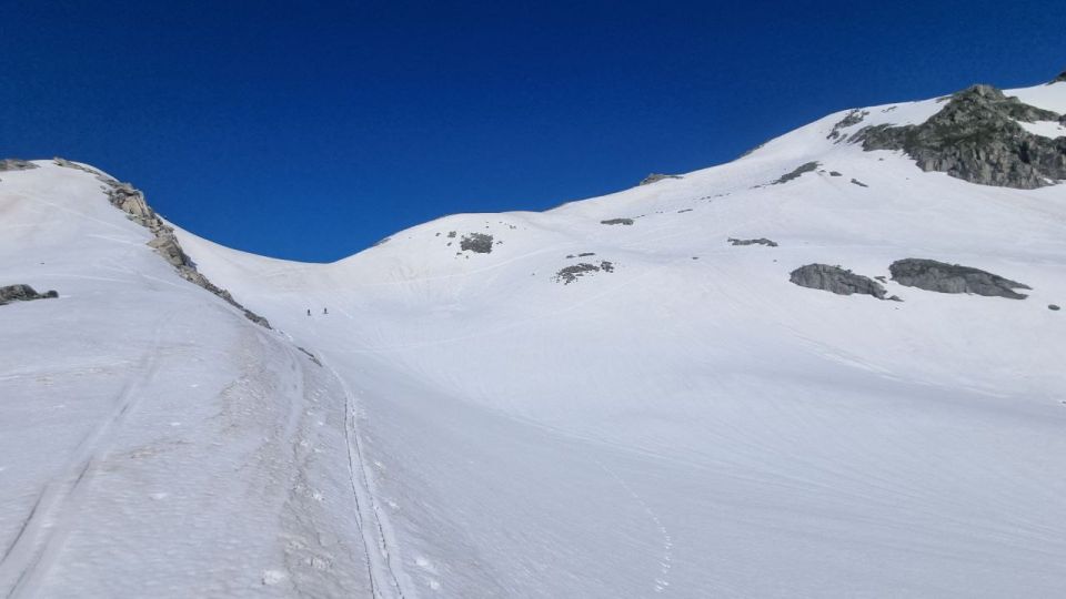 Start direkt ab Parkplatz am Pass um 8.30 Uhr. Schnee gut tragend und hart. Selbst auf den Süd-Ost-Hängen mit direkter Sonneneinstrahlung zwar weich aber gut zu gehen. Abfahrt in gutem Sulz mit Saharastaub-Schnee.