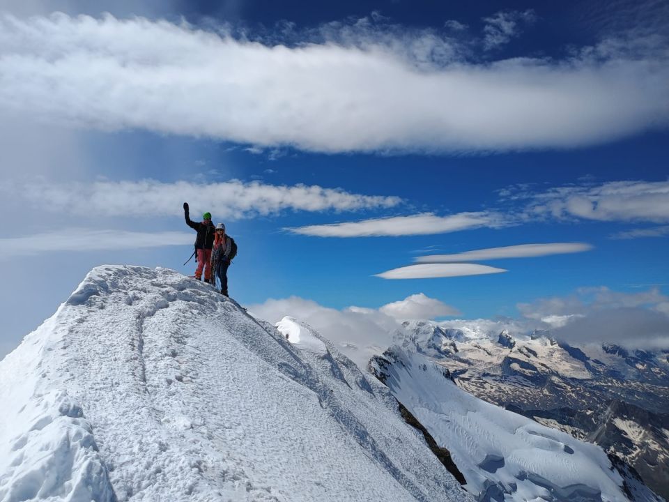 Festigletscher sehr gut eingeschneit. Bereits vor dem Gletscher hat es Schneefelder. Felsen zum Festijoch und Festigrat gut im Fels zu klettern bis Höhe erster Serac (ca. 4000m), nur wenige Schneestellen am Grat. Bis hierher vorteilhaft alles ohne Steigeisen. Der erste Gendarm, gleich nach dem Festijoch, ist wohl in letzter Zeit auch im Schnee umgangen worden, es hat alte Spuren, ist aber schon recht eisig inzwischen. Ab erster Serac guter Trittschnee, gute Spur.