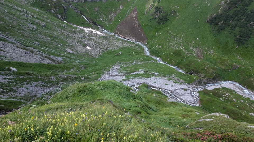 Nach knapp zwei Stunden erreiche ich Hinterbalm; die Wolken sind sogar noch dicher geworden, und ich beschäftige mich langsam mit einem Plan B. Am Abzweig zum Tschingelsee auf 1900m lichten sich die Wolken endlich, rasch wird es klar. Der Weg zum Tschingelsee ist gut zu finden, aber im unteren Teil sehr nass und rutschig. Für mich de facto der anstrengenste Teil der Tour heute.
