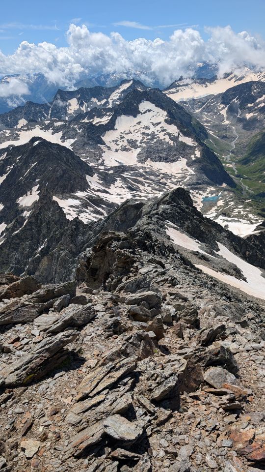 Der Grat selbst ist trocken und tiptop zu begehen. Ich erreiche den Gipfel gegen 12:40 und mache eine kurze Pause an der windabgewandten Seite. Beim Abstieg nehme ich den "normalen" Weg, bei dem man sich etwas westlicher hält und den flachsten Teilen der Schneefelder folgt. Man kann zur Zeit noch recht weit auf Schneefeldern abfahren, aber ganz bis zum See reicht es nicht mehr.