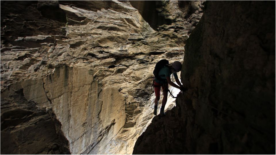 Das ist schlichtweg genial. Auch der Rest des Klettersteigs ist wunderschön. Wünschenswert wäre allerdings, dass man nicht zwingend an der Decke entlang hangeln muss, sofern man nicht nass werden will.