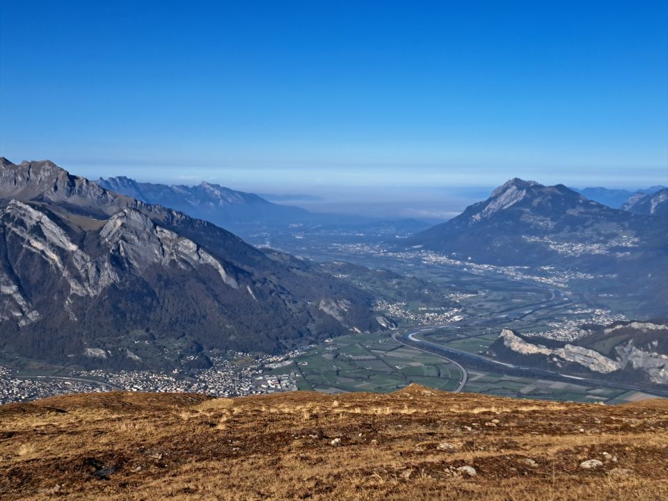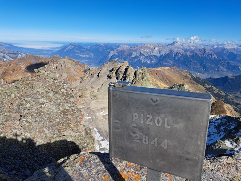 Gipfelschlussaufstieg ab Pizollücke sonnseitig trocken und schneefrei und gut mit Seilen gesichert.