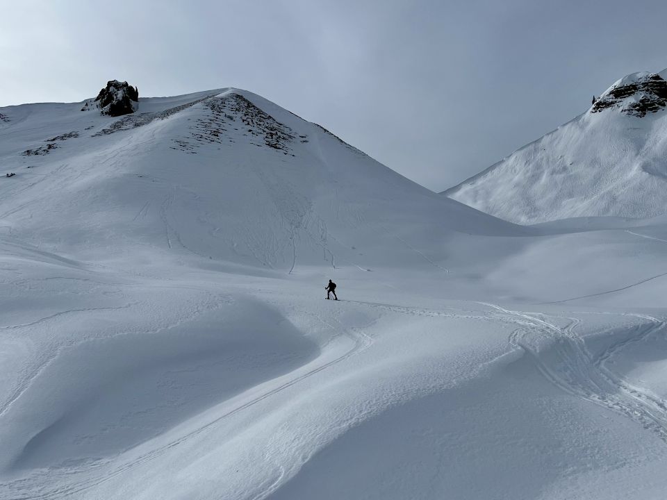 Nasser, schwerer Schnee vom Start bis zur Grimmifurggi. Dann praktisch komplett schneefrei, da weggeblasen. Die letzten 300 Hm sind wir auf Gras gewandert.