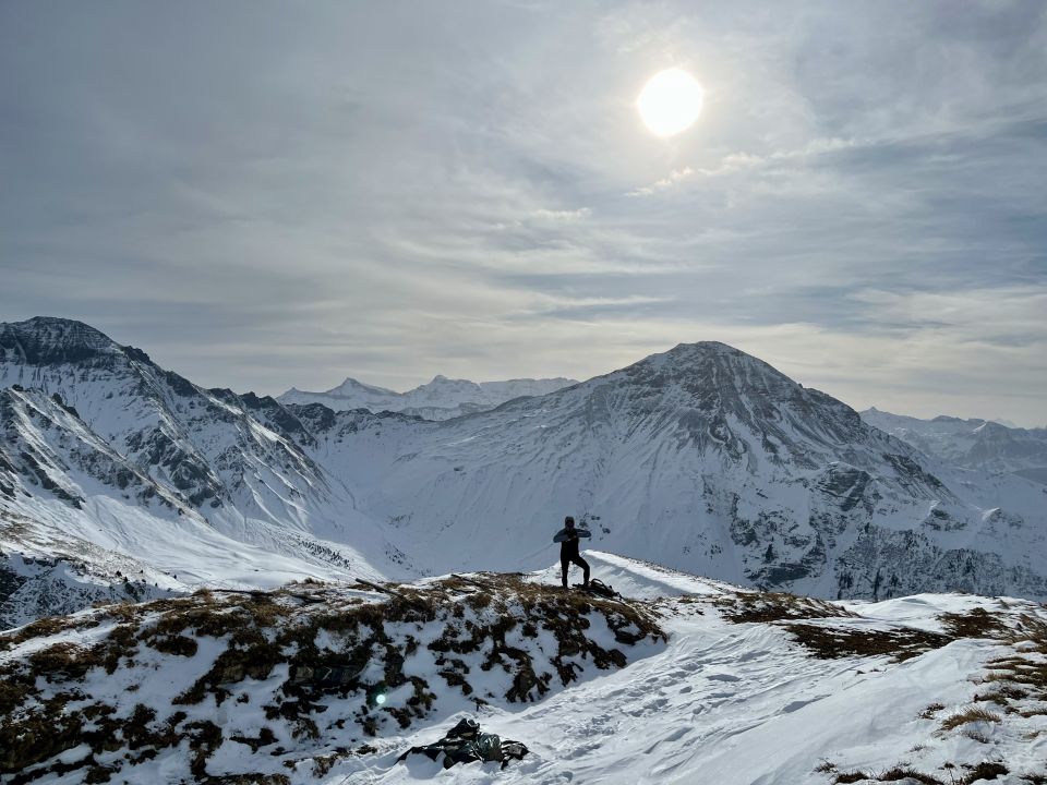 Alle Gipfel in der Umgebung sind westseitig schneefrei. Der Wind hat die Schneemengen am Do und Fr in die Ostflanken verfrachtet, wo sie jetzt für höhere Lawinengefahr sorgen.