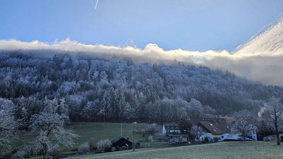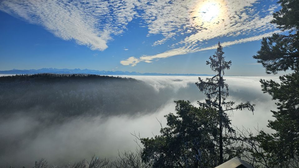 Alpensicht mit Nebelmeer, Rauhreif an Bäumen