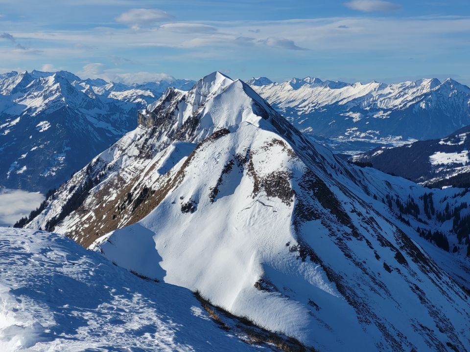 Aufstieg problemlos, mehrere Spuren vorhanden.Ausstieg aus dem Nordwesthang über die kleine Wächte geht auch problemlos. Am Gipfel hat es zuwenig Schnee, darum Aufstieg zu Fuss (siehe Foto).