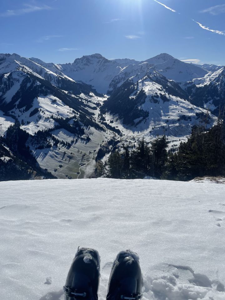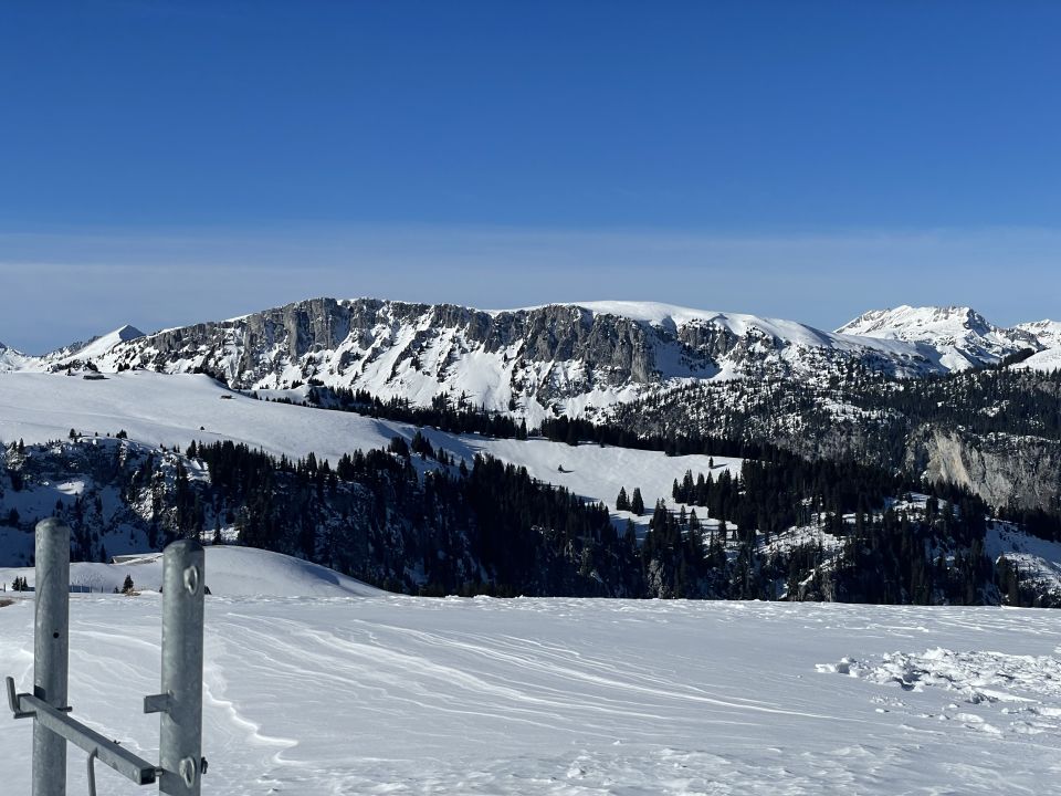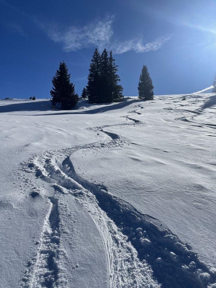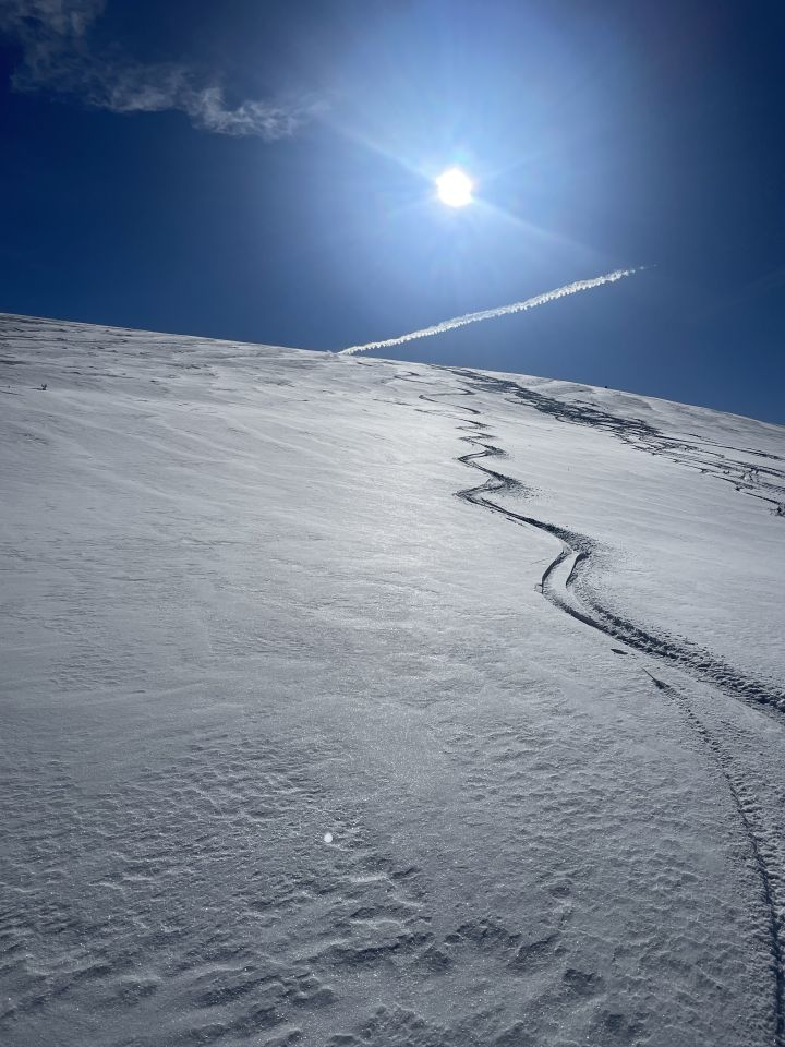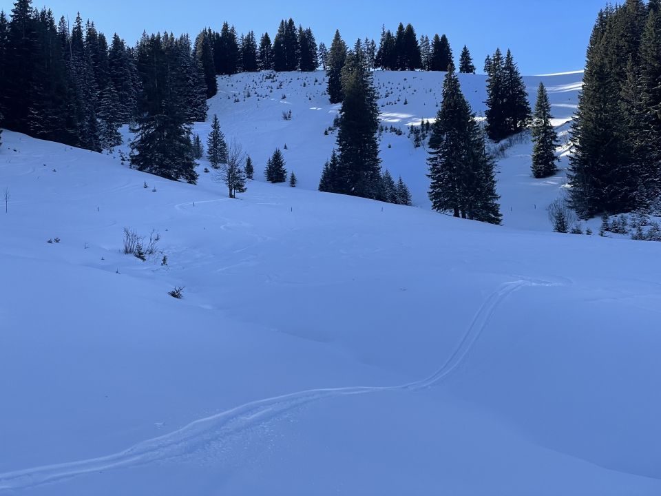 Glanzvolles Wetter, minus 2 Grad beim Start und ein Hauch Neuschnee von vergangener Nacht, unten 1-2 cm, oben ca 5cm, und erstaunlicherweise wenig Leute hier, da muss man „ausgezeichnet „ geben. Minimes Gemecker gäbe es allerdings schon, dazu später. Aufstieg problemlos, unten nur sehr wenig Unterlage, aber da hat man ja die Alpstrasse. Weiter oben ab der Sennhütte teils abgeweht und eisig. Das kurze Steilstück zum Glück nicht verweht und gut zu gehen. Oben fast alleine, und das an einem Sonntag:-). Abfahrt: im Gipfelhang teils Winddeckel, teils schöner Pulver. Weiter unten je länger je mehr die alten Spuren spürbar, das ratterte wie Tramschienen. Letzter Hang auf der Strasse gut fahrbar. Wind und halt wenig Neuschnee waren bei der Abfahrt ein wenig Spielverderber, aber das ist Jammern auf hohem Niveau.