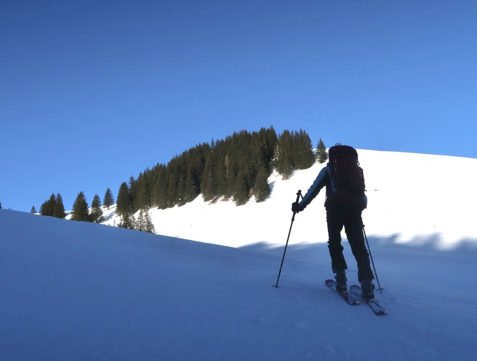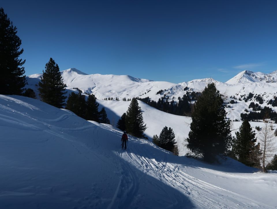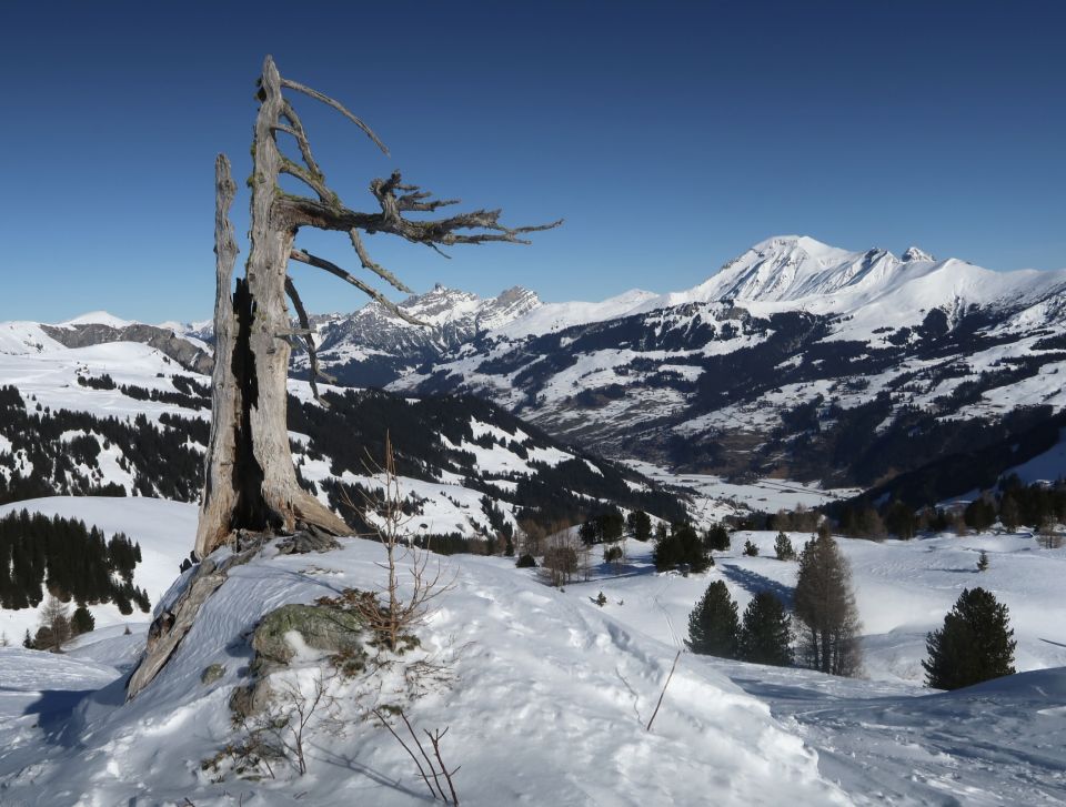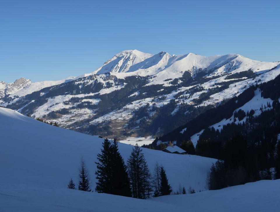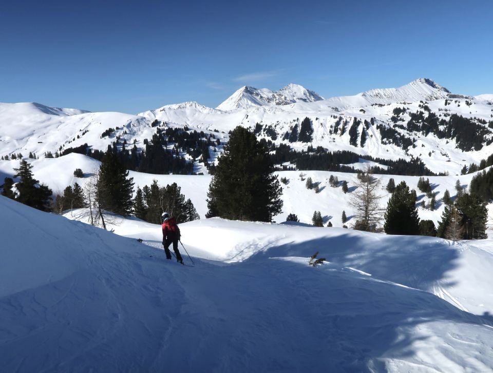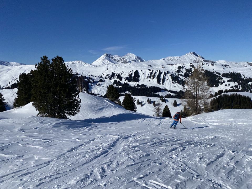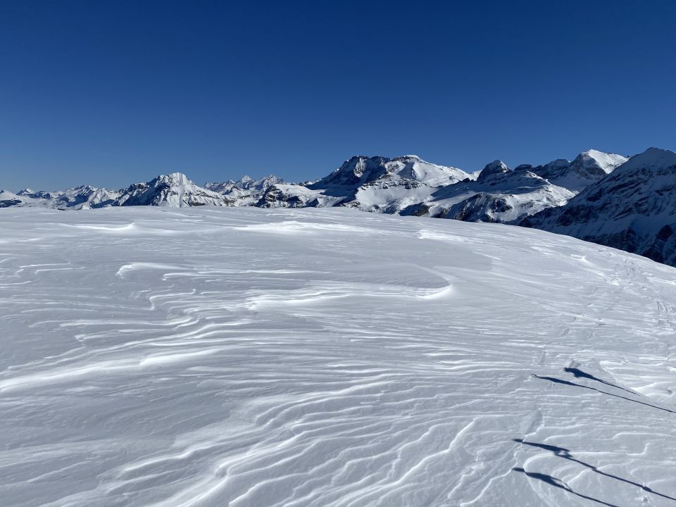 Oberhalb der Lindi Chäle: Abgeblasen, hart, ruppig, verschiedenste Schneearten, Unterhalb im Pöris noch mehrheitlich Pulverschnee, zunehmend verfahren.