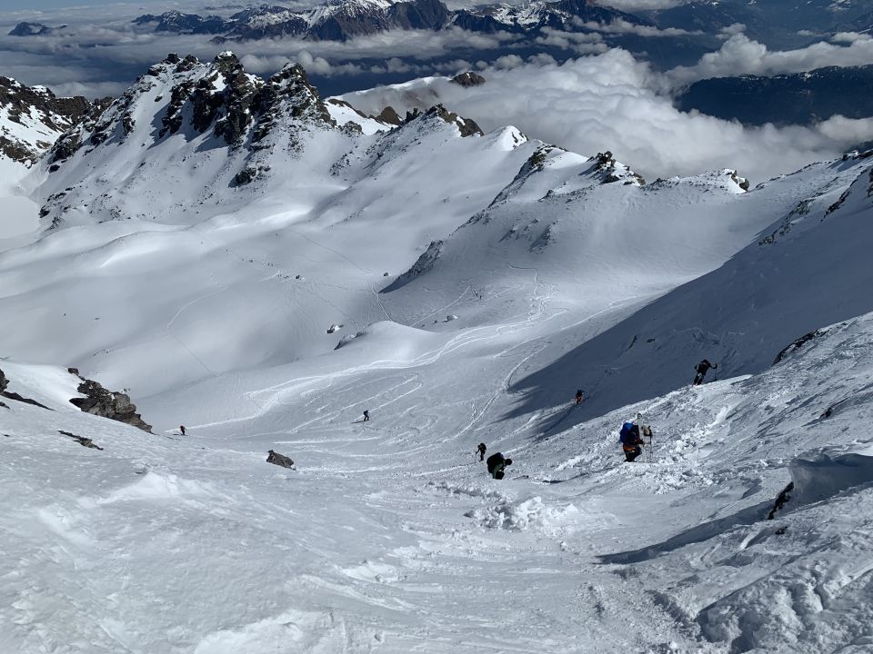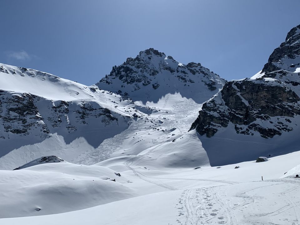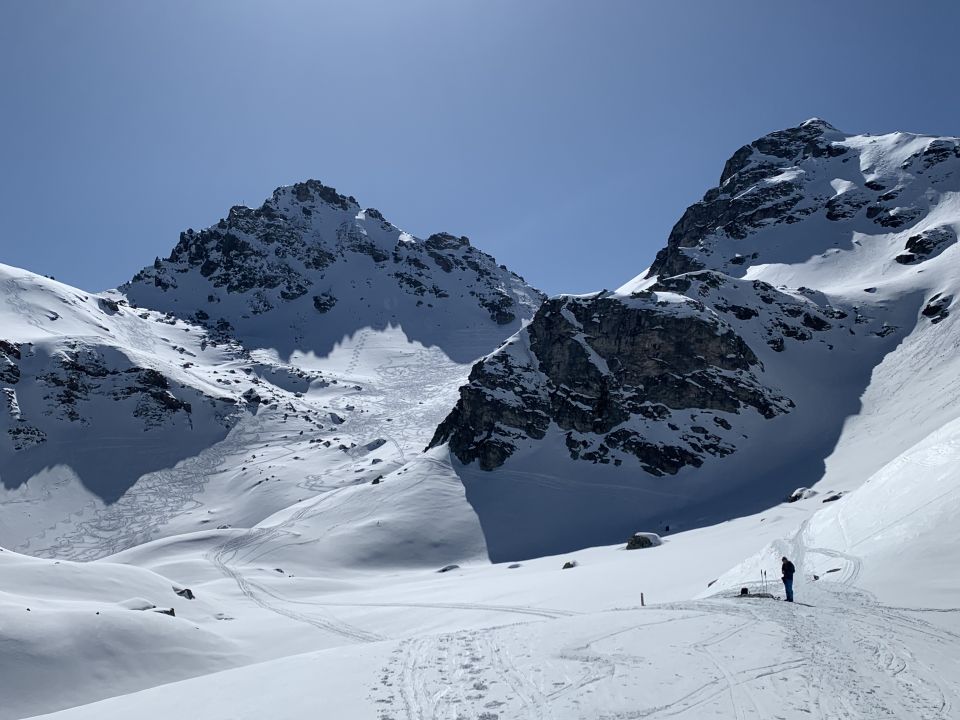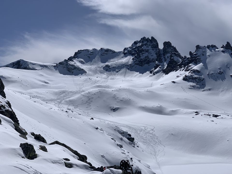 Überraschend gute Verhältnisse – etwa 10 cm frischer Pulver auf harter Unterlage; nur an der Wildseelugge ein paar Meter Fußabstieg, Ansonsten auf perfekter Spur zum Sattel, letzte Meter etwas hart,