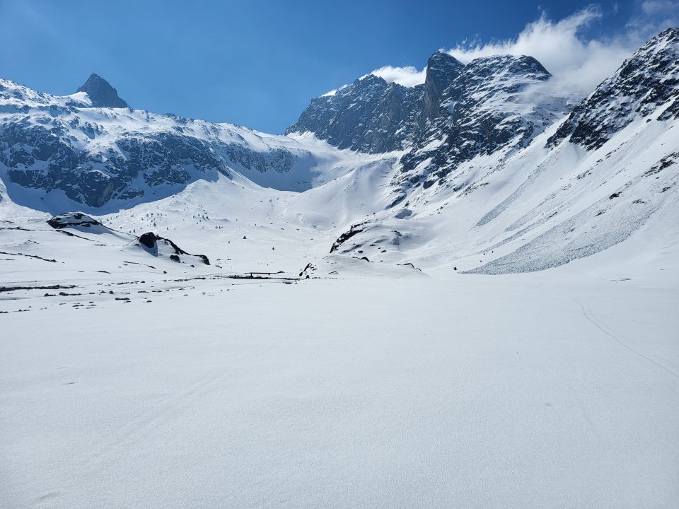 Einfahrt Daros la Bura durch Eisfelder und fresistehende Felsen etwas umständlich. Dann Schöne Abfahrt bis ca. 2200. Zwischen 2200 und 2100 nicht immer tragender Deckel. Dann schön aufgefirnt über die Schwemmebene.