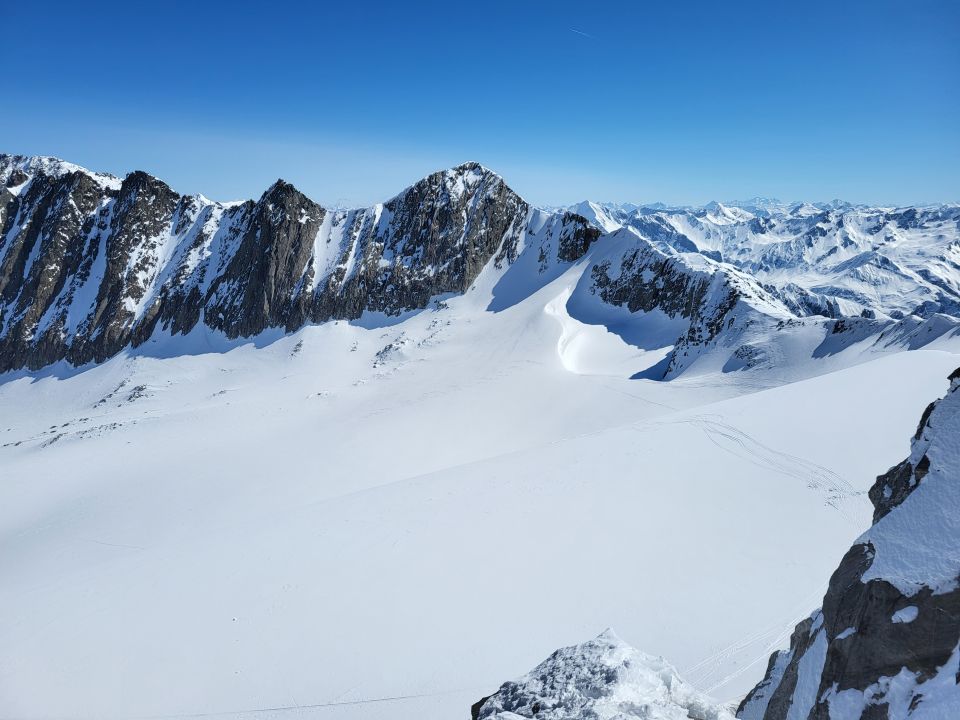 6.4. Piz Cristallina mit schöner Abfahrt durch die obere Scharte. Südseitig beim Aufstieg noch etwas hart. Bei der Abfahrt vom Gipfel schon leicht aufgefirnt.
