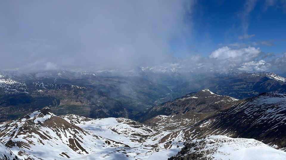 Um 11.20 Uhr konnte ich vom Gipfel aus die grasgrüne Savogninerseite bestaunen. Ein unglaublicher Berg. Von jener Seite wäre er im Moment ohne Skis besteigbar.