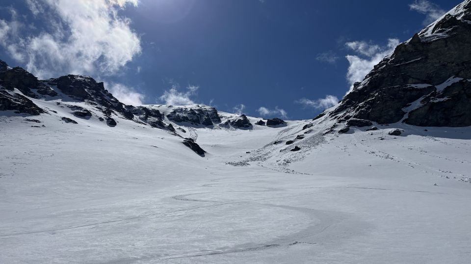 Endlich wurde der Blick in die Schlüsselstelle, den Flaschenhals, sichtbar. Oft ist dieses Couloir bereits mit Nassschneerutschen durchfurcht.