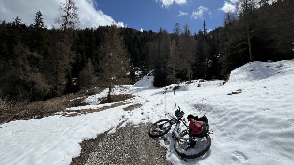 Nach 1 1/4 h sind die Skis montiert, das Bike deponiert und ich motiviert. Die Schneedecke war knallhart. Doch bereits nach 200 m war die Strasse und auch jede Abkürzung via Halde aper.