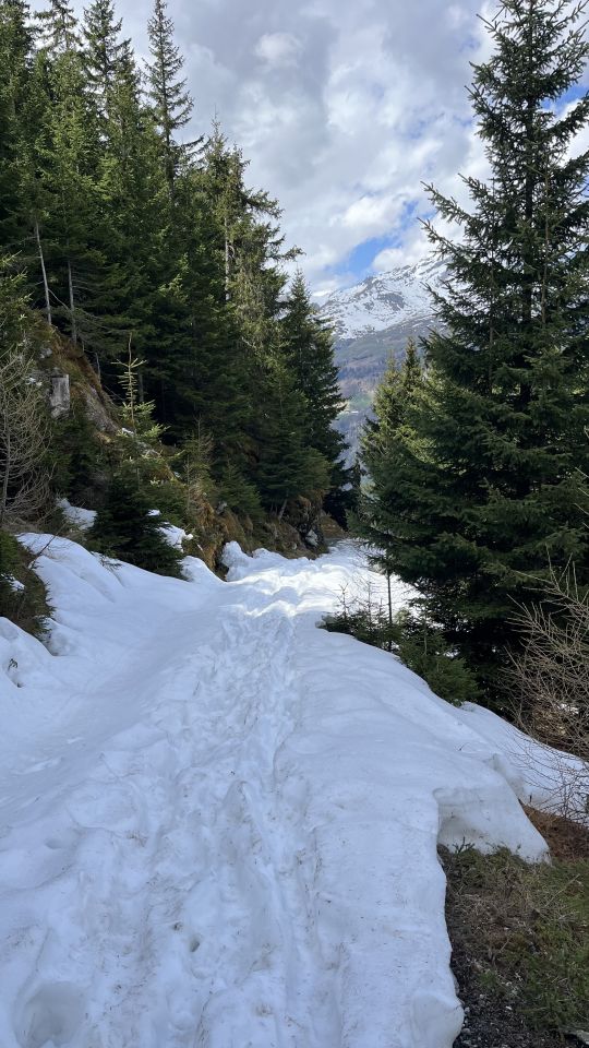 Um 8 Uhr nahm ich die noch „flachen“ 300 Höhenmeter hinauf zur Abzweigung Richtung Alp Tischatscha unter die E-Bike-Räder. Da der Akku nicht mehr der neuste ist, war sparen angesagt.