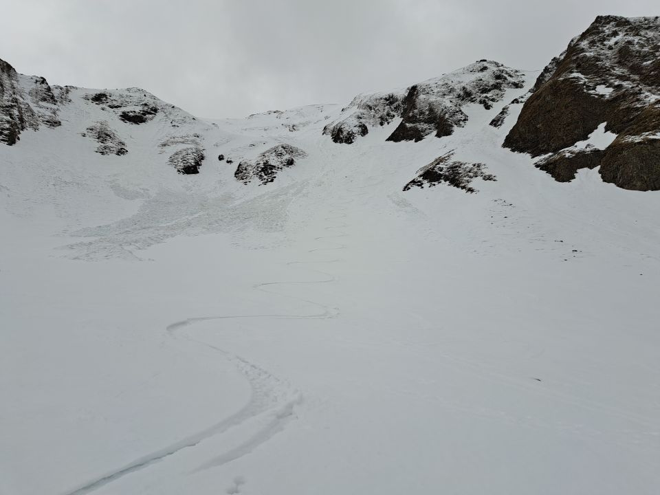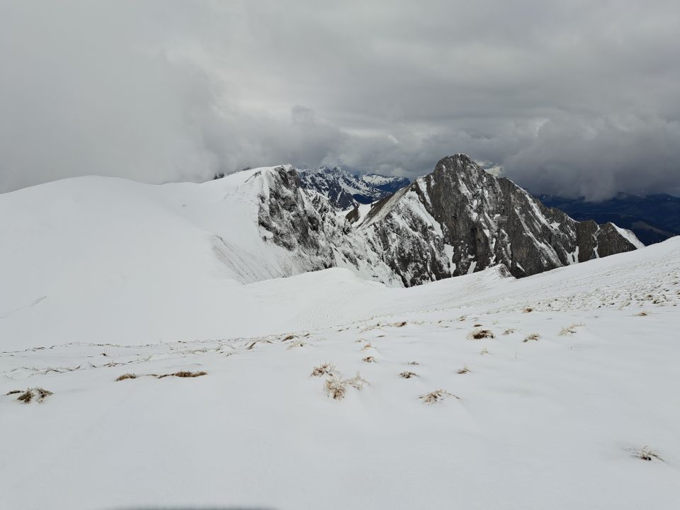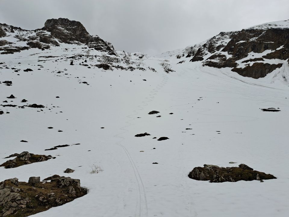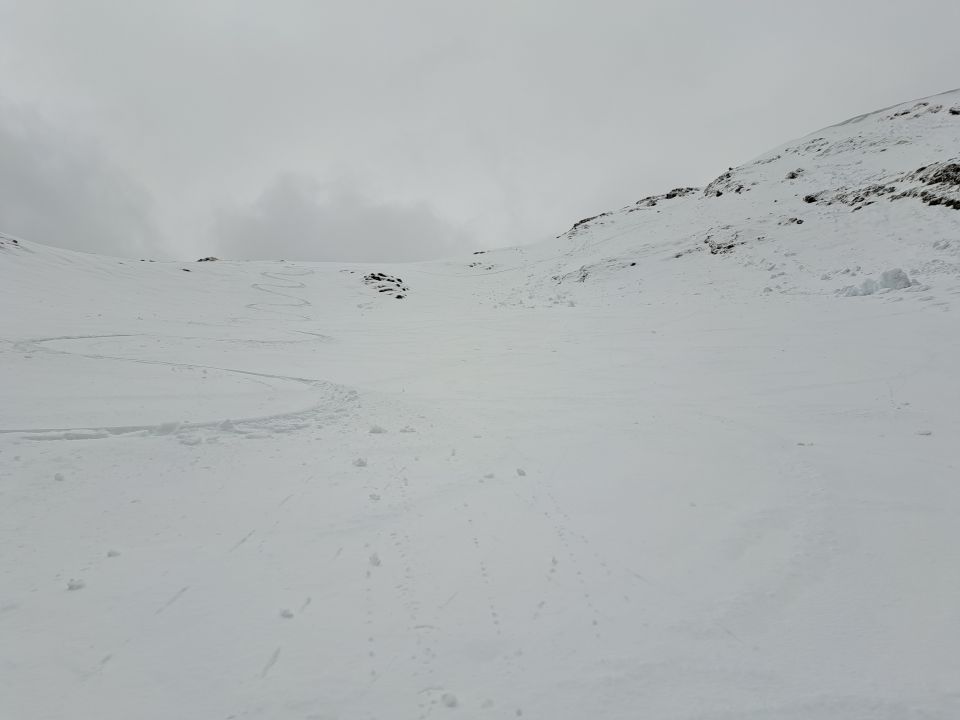 Abfahrt Nordflanke oben wenig Pulver auf brechendem Harschdeckel und darunter Nassschnee ging mit weiten Bögen gut.