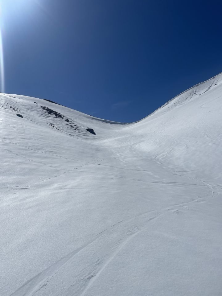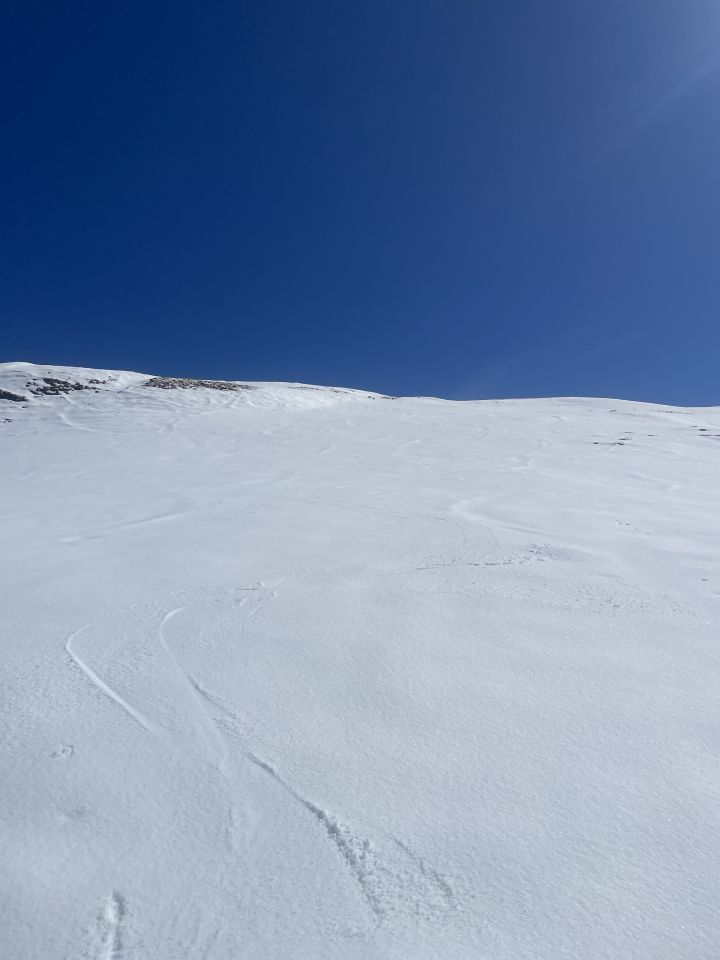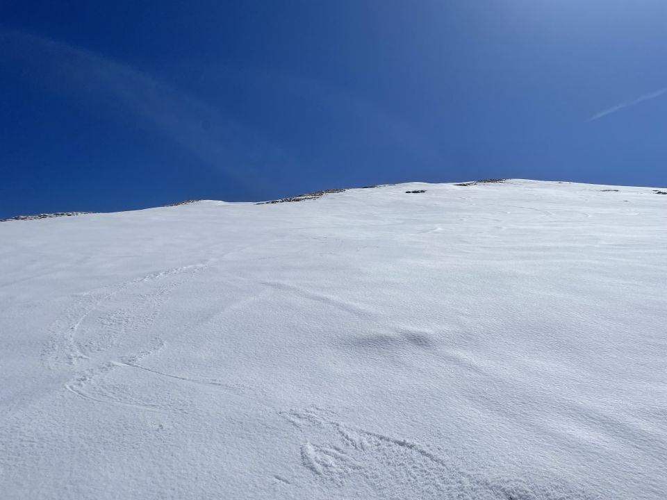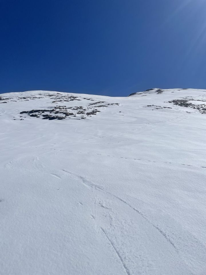 Mit dem Auto bis Punkt 1400 der Strasse nach, dann Skitragen bis zur Alphütte 1740. Weiter mit Fellen, Schnee bis unterhalb Grimmifurgg nicht tragend. Es hatte gestern Abend im Gebiet recht stark geregnet und dia Abstrahlung konnte das nicht mehr alles richten. Aber ab dort bis zum Gipfel tipptopp gefroren, so tipptopp, dass ich um die Harscheisen froh war. Das Wetter war prächtig und ausser mir nur noch Tierspuren vorhanden, deren Urheber man erraten, aber nicht sehen konnte. Schöne Rast auf dem Gipfel. Die Abfahrt dann absolut perfekt bis kurz unter der Furgg, dann brach man durch und der Rest war Schweigen, respektive dann wieder Tragen.