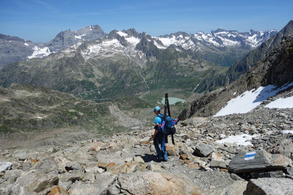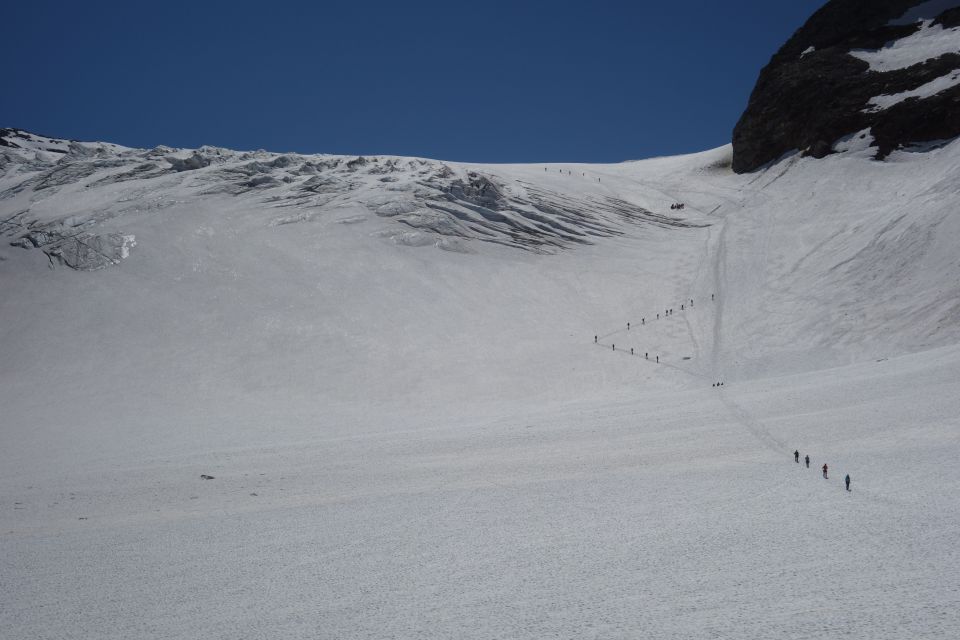 Last day of the season with light and shadow. We left at 6 from the last parking lot at the end of the private road at 2100. We walked up the path (often equipped and a bit difficult, shoes recommended) to the refuge. Then we put on skis on snow that had frozen hard thanks to the clear sky of the night despite the freezing point above 4000. Snow in bowls and frozen up to two hundred meters from the top. Not an easy climb, we put on crampons from 3100. Then a big block for the 3cm of new snow at the top. Only people on foot going up. At 1030 on the way down it had given up a bit, 4 stars at the top, two at the bottom. Here the shadows. We wanted to go down the slope on the orographic left of the refuge that you take all the way to the left going up a bit. After a bit of fiddling we gave up due to the lack of tracks and not being able to understand how much of an obstacle the ice and crevasses that could be seen halfway up the steep high slope could pose. The girl at the refuge didn't help us much, saying she didn't know the conditions but that in the last three days of great heat they had worsened a lot. End of story, great effort to walk down the ascent path and as soon as we reach the car we see two skialps (who knows where they came from?) who enter the slope and easily overcome the sections that from afar seemed more difficult, arriving ten minutes from the car .... Good dose of nerves .... But that's okay. Beautiful places, with Gabri.