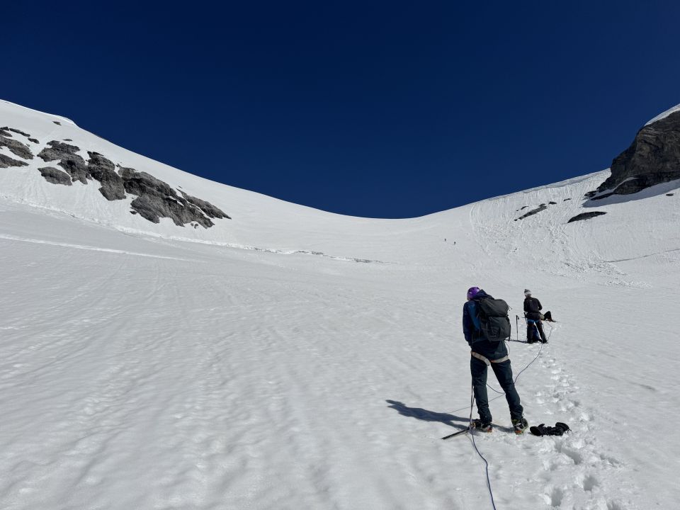 Spalten weiter oben schön zu, Bergschrund problemlos. Schnee wird schnell weich bei gutem Wetter, daher lieber früh wieder runter sein