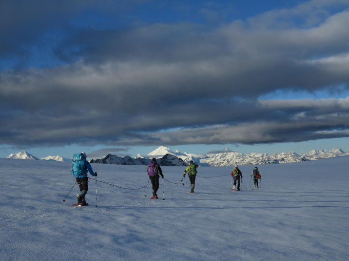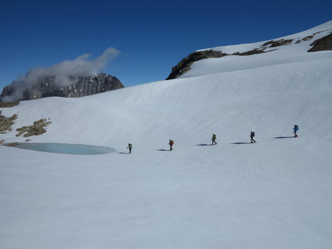Gut eingeschneite Gletscher. Die günstige Schneelage erleichtert vor allem den Abstieg bis zum Spalihorn. Der Schnee ist aber weniger gut verfestigt als auf den vorherigen Touren im Trient Gebiet und am Wildstrubel. Schneeschuhe sind hier immer noch von Vorteil.