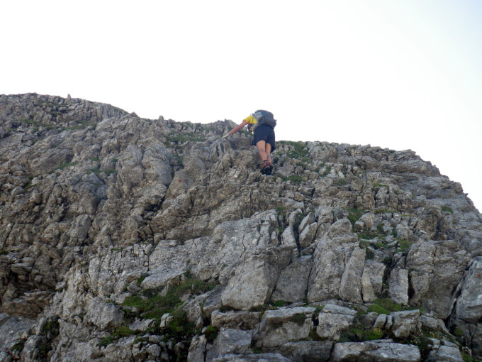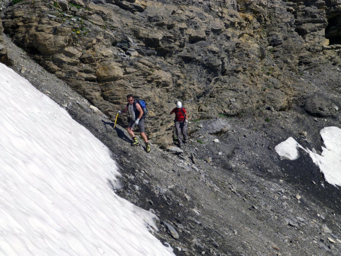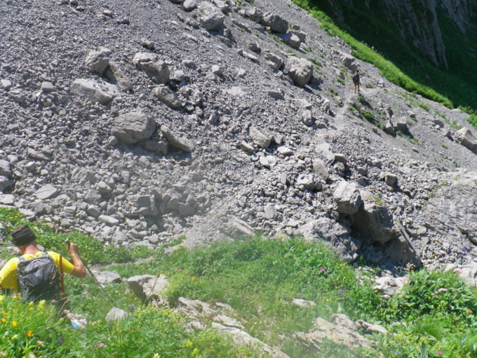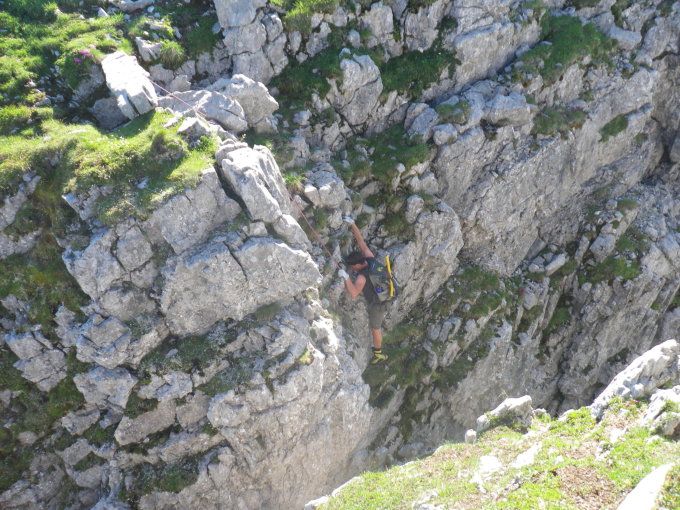 In der Rot Chälen etwas nass aber dank der Fixseile kein Problem. Bei der Scharte "Roten Eggen" ist ein kurzes Seil für weniger geübte von Vorteil.