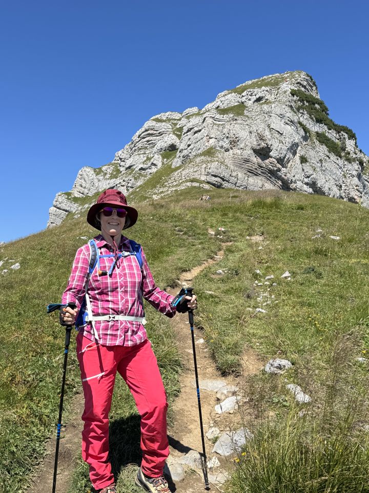 Bis auf wenige Meter im Gras ist der Weg immer gut sichtbar und führt auf dem kürzesten Weg über den langen Grasrücken bis zum Gipfelgrat. Dieser ist sehr ausgesetzt und ich habe die Stöcke und den Rucksack deponiert und bin ohne Ballast über die Steine gekraxelt, teilweise nur 20 cm breit, auf beiden Seiten geht es sehr steil bergab.