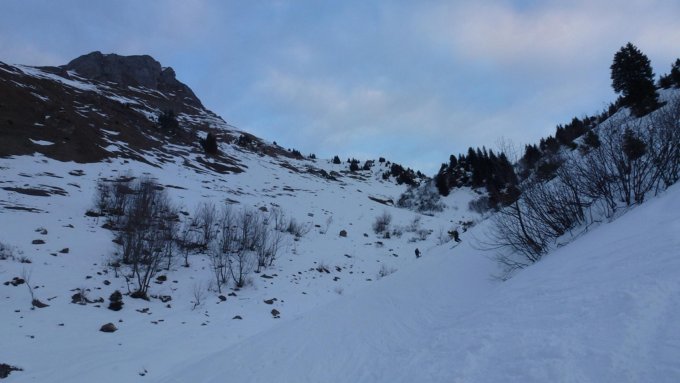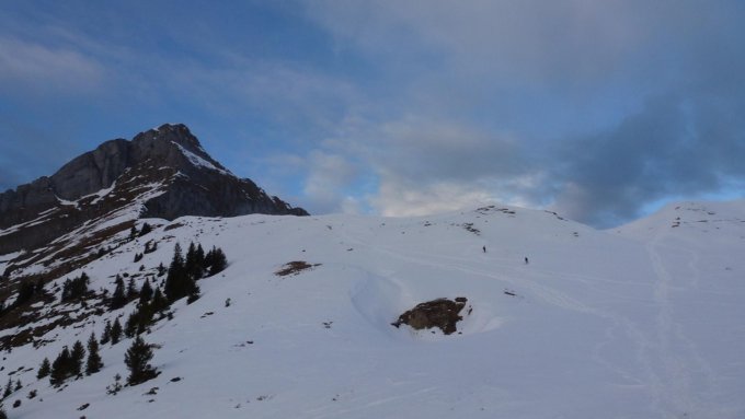 Die Schneelage war mäßig; ein bisschen Pulverschnee, bereits angefirnte Hänge (erinnert eher Verhältnisse im Frühjahr) und schon stark verfahrene Bereiche wechselten sich ab. Auf Steine musste man achten. Die Südflanke vom Zelsegg zur Rinne war quasi aper. In der Rinne selbst gab es schon etwas festeren Stapfschnee, über den mit Steigeisen gut zu gehen war. Im Gipfelanstieg lag zwischendurch tiefer Pulverschnee, welcher teilweise abschüssige Felsplatten tückisch abdeckte. Das Wetter war ruhig und gelegentlicher, strahlender Sonnenschein wechselte mit überwiegender hoher Schichtbewölkung ab; leider auch auf dem Gipfel. Dieser steht markant da und eröffnet einem einen grandiosen Rundblick.