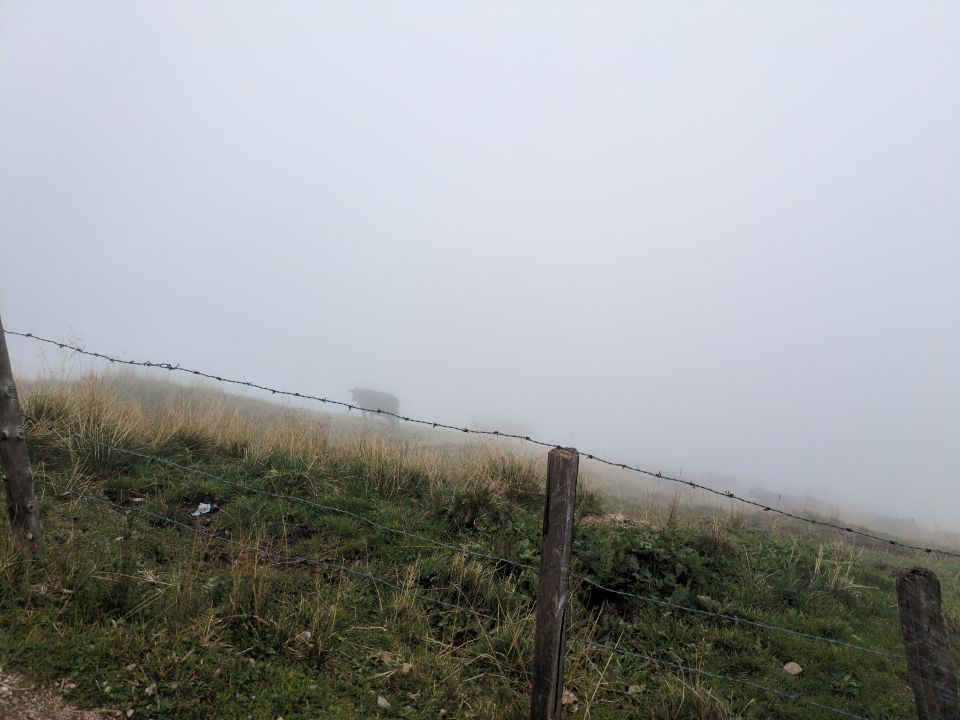 Neblig, kühler Wind und Kühe mit Jungtieren