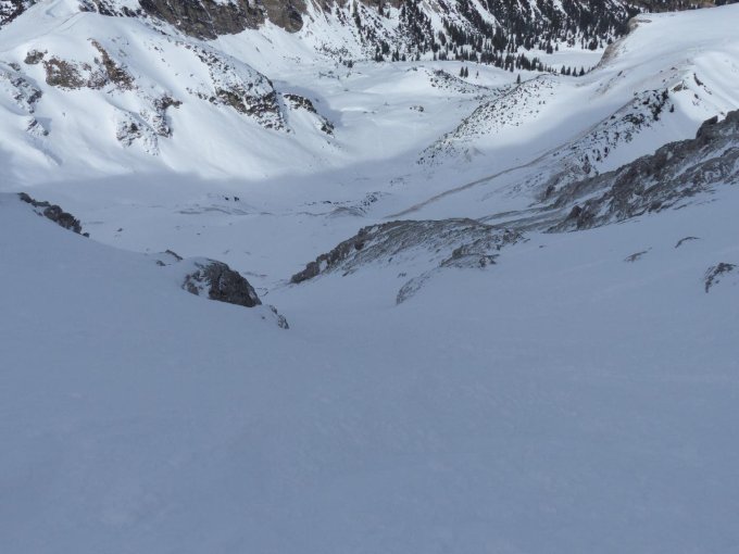 Top-Bedingung in Gipfelrinne - wir haben nun erste Abfahrtsspur in rechte (in Abfahrt) Variante gelegt.