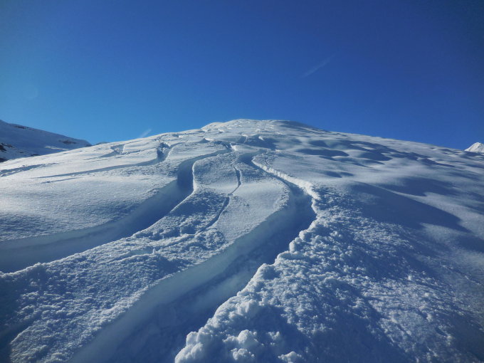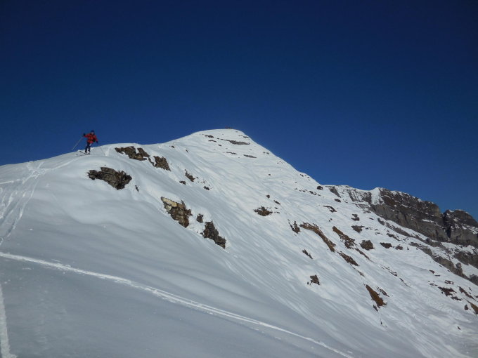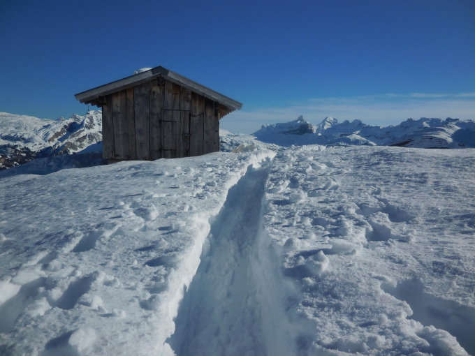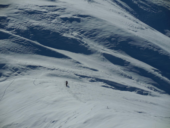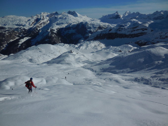 Abfahrt auf Aufstiegsroute, zeitweise Deckel aber auch schöne Pulverhänge angetroffen , kein Steinkonakt heute, Schneehöhe 10 cm - 80 cm im Gebiet vom Bisisthal, letzter Schneefall mit wenig Windverwehungen.