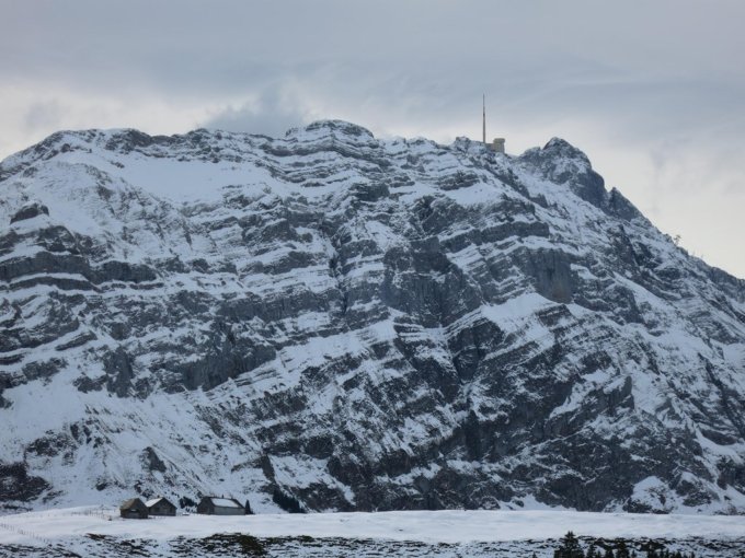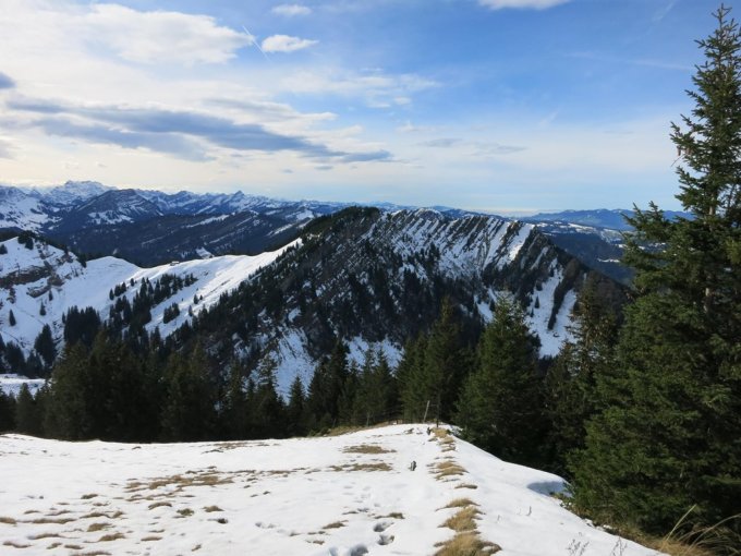 Start um 9:15 bei 3°C und frischem Südwind. Strasse bis Alp Löchli schneefrei. Dann auf dem Weg viel Matsch; besser über die Wiese weiter. Nach der Scheidegg bis zur St. Jakob-Kapelle wegen den vielen Begehungen teilweise Eisauflage, aber auch apere Stellen. Ganze Querung unter dem Kamm bis zum P.1510, hat ca. 25 cm Schnee da nordseitig. Weiterweg teils aper, sonst gut gespurt.