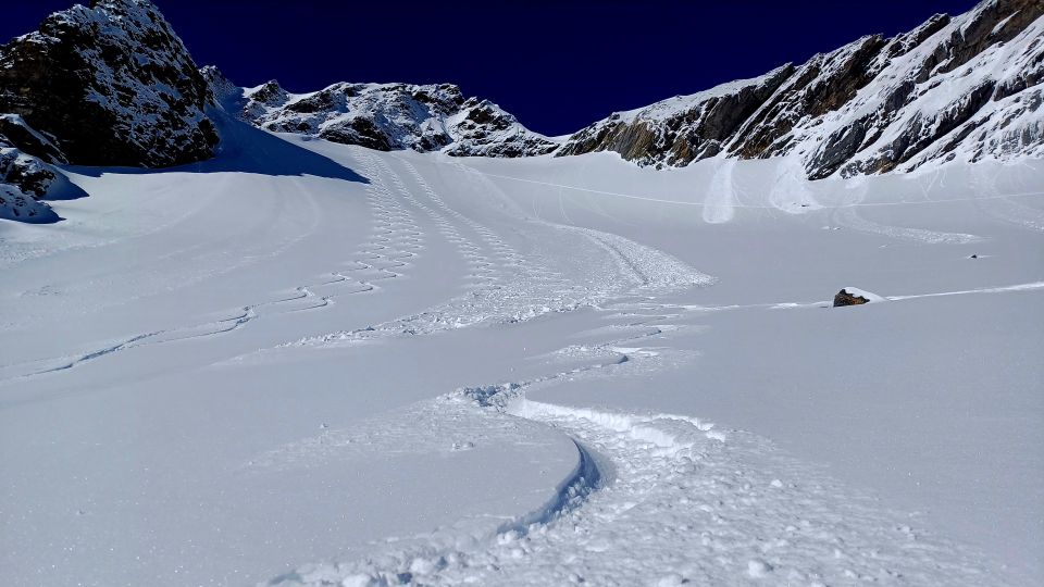 bis 50 cm Pulverschnee auf dem Gletscher, darunter zu wenig Schnee