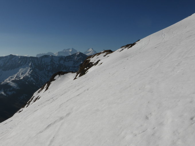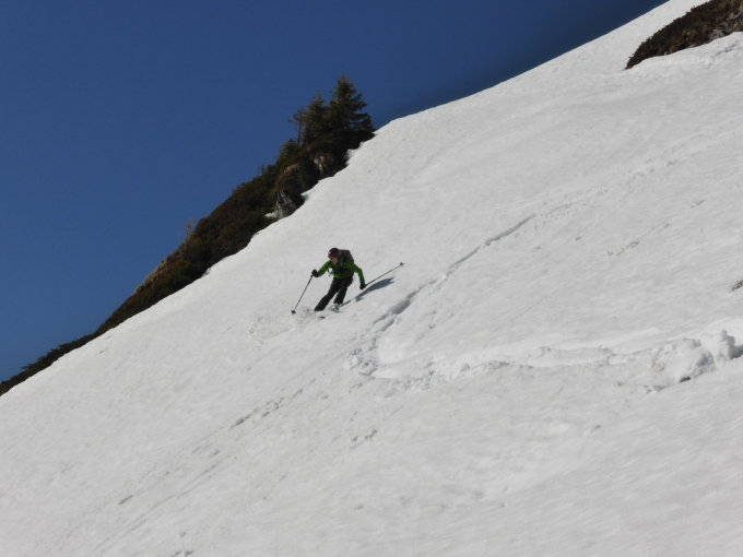 Schnee: Das Ende der Saison naht an der Schrattenflue. Trotzdem ab Waldeintritt kurz vor Pt.1455m genügend Schnee, abgesehen von einigen kurzen Tragstellen. Bei der Chlushütte 1774m kurz etwas abwärts zu Pt.1757m dafür durchgehend Schnee. In der Abfahrt war der Gipfelhang bereits relativ weich (09.00Uhr) aber gut fahrbar. Danach noch etwas Richtung Böli aufgestiegen um die schönen Hänge zu geniessen. Sehr gut fahrbar bis zum Ende des Waldes, kurz nach Pt.1455m.
