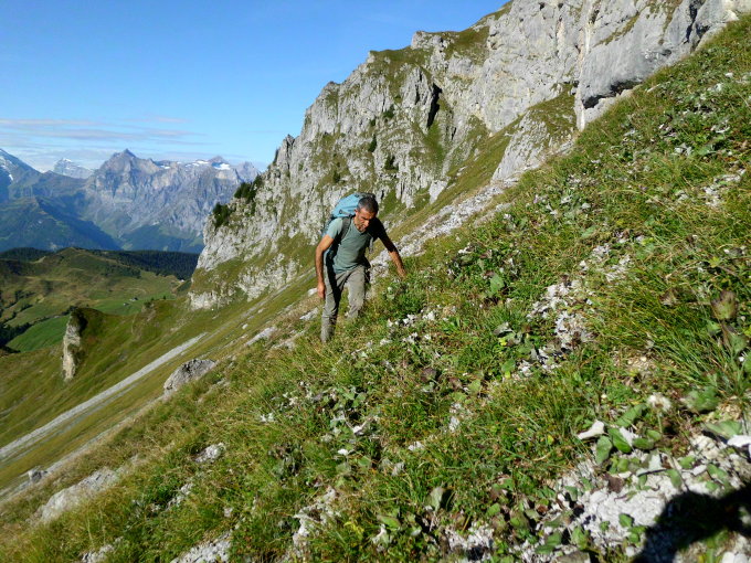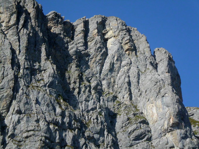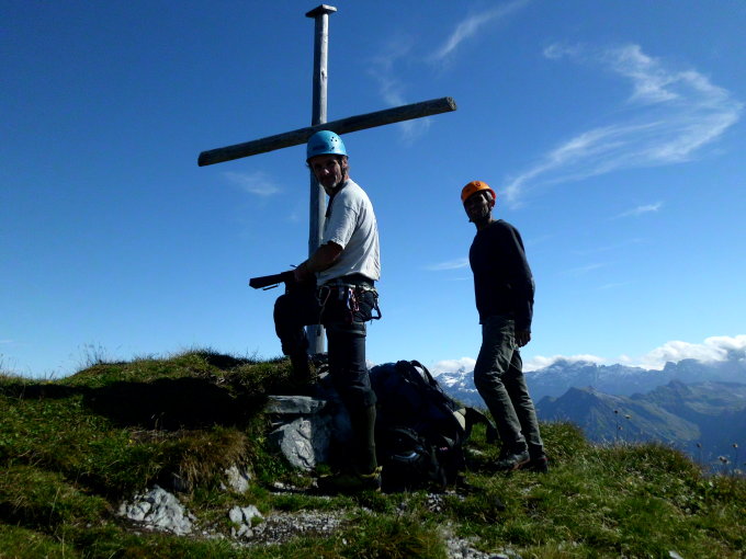 Unverhofft kommt oft: auf dem Weg zum Einstieg des "Putztifel" entdeckten wir den gelb angeschriebenen Einstieg mit der Aufschrift "H.G. Südwand". Es gibt noch eine weitere Südwandroute deutlich weiter links, nahe dem Abstiegscouloir, welche sich im Känel Plaisir Ost findet. Es kam uns wohl etwas sonderbar vor, doch beschlossen wir spontan, die vermeintliche Südwandroute aus dem Plaisirführer zu klettern und kamen so zufällig zu dieser offensichtlich selten bekletterten Hauptgipfel-Südwandroute (letzte Begehung lt. Wandbuch im Juli 2013).