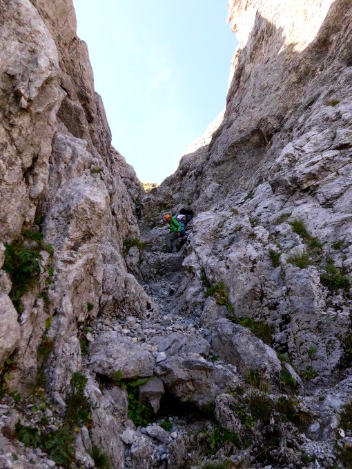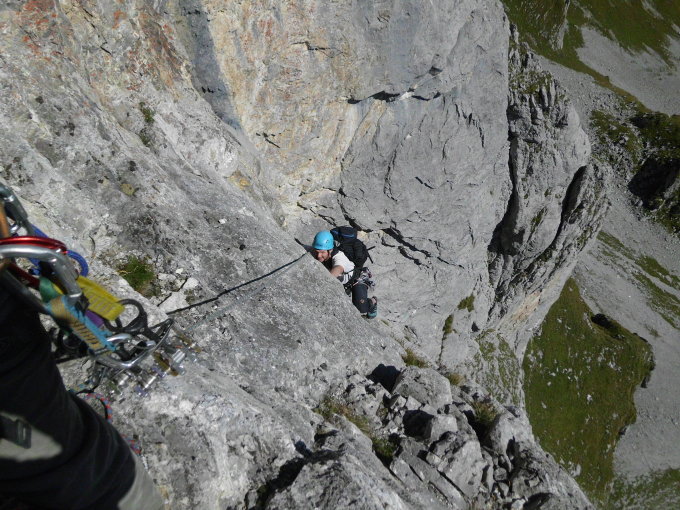 Obwohl gelegentlich recht brüchig, bereitete uns diese Tour doch viel Freude mit einem Schuß Abenteuer, denn schließlich war es eine Kletterei ins Ungewisse. Immer wieder bieten hübsche Verschneidungspassagen auch kompakten Fels. Auch die Querung war unterhaltsam. Unser Dank an Toni Fullin für die Sanierung!