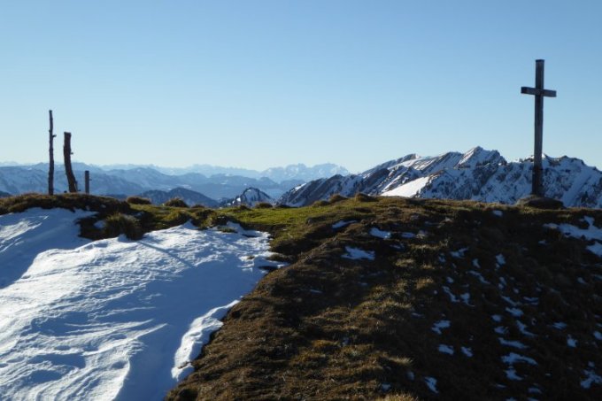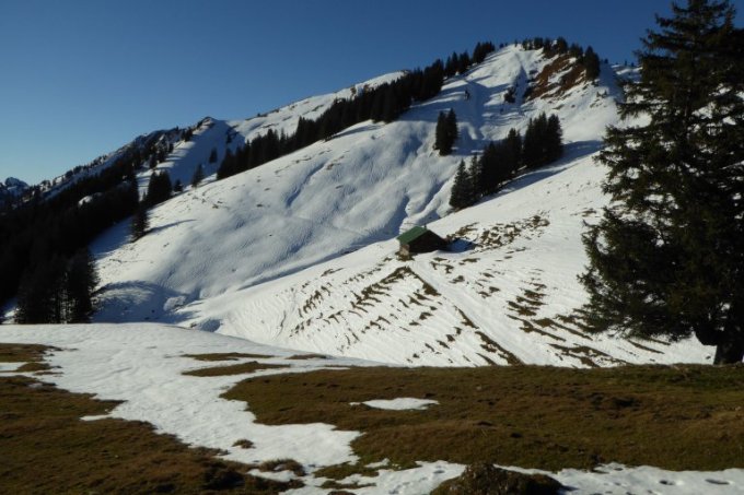 Bis oberhalb Ornach kaum Schnee. In der steilen Rinne zum Rothenkesel hoch einige