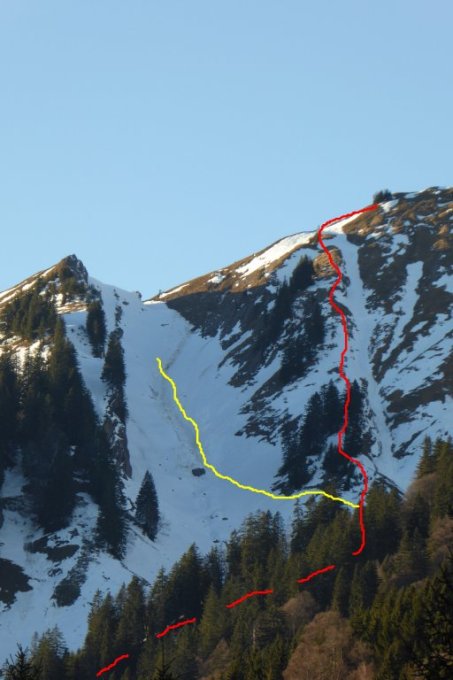 Abrutsche zu queren, man kann ab Mitte auch rechts in Wald ausweichen. Die S-Flanke hat schon ziemlich entladen, aber liegt doch noch einiges drin. Wollte in der Mittagswärme nicht unbedingt dort hoch. Wählte somit die Rippe zwischen der Großen und kleinen Schneerinne linker Hand. Nach einem Drittel verlies ich den Sporn nach links in die große Rinne. Heute die totale Fehleinschätzung (Alter schützt vor Torheit nicht). Durch die Oberflächenabrutsche blankgefegt (Verhältnisse wie in "Celerina") und die Lawinenbollen Betonhart. Durch fehlende "Hardware" hatte nur die leichten Sommerstiefel an, letzt endlich der Entschluß zur Umkehr (Abstieg noch heikler). Zurück zum Sporn auf diesem dann mit merklichem Zeitverlust zum Gipfel. Obwohl ich die Rinnen im Auf-u.Abstieg kenne, mit und ohne Ski, man lernt nie aus.